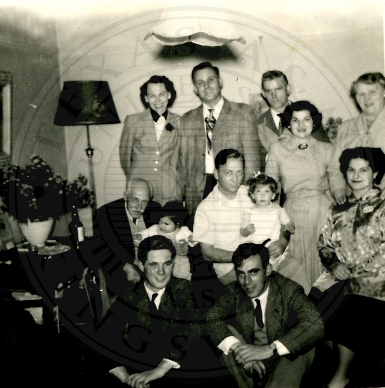 Al Eakin Birthday party. Group photo. Two unidentified men seated on the floor in front. Two unidentified men seated in chairs with babies on their laps, and an unidentified woman seated to the left of them. Two unidentified men and three unidentified women, one elderly, are standing behind the group |