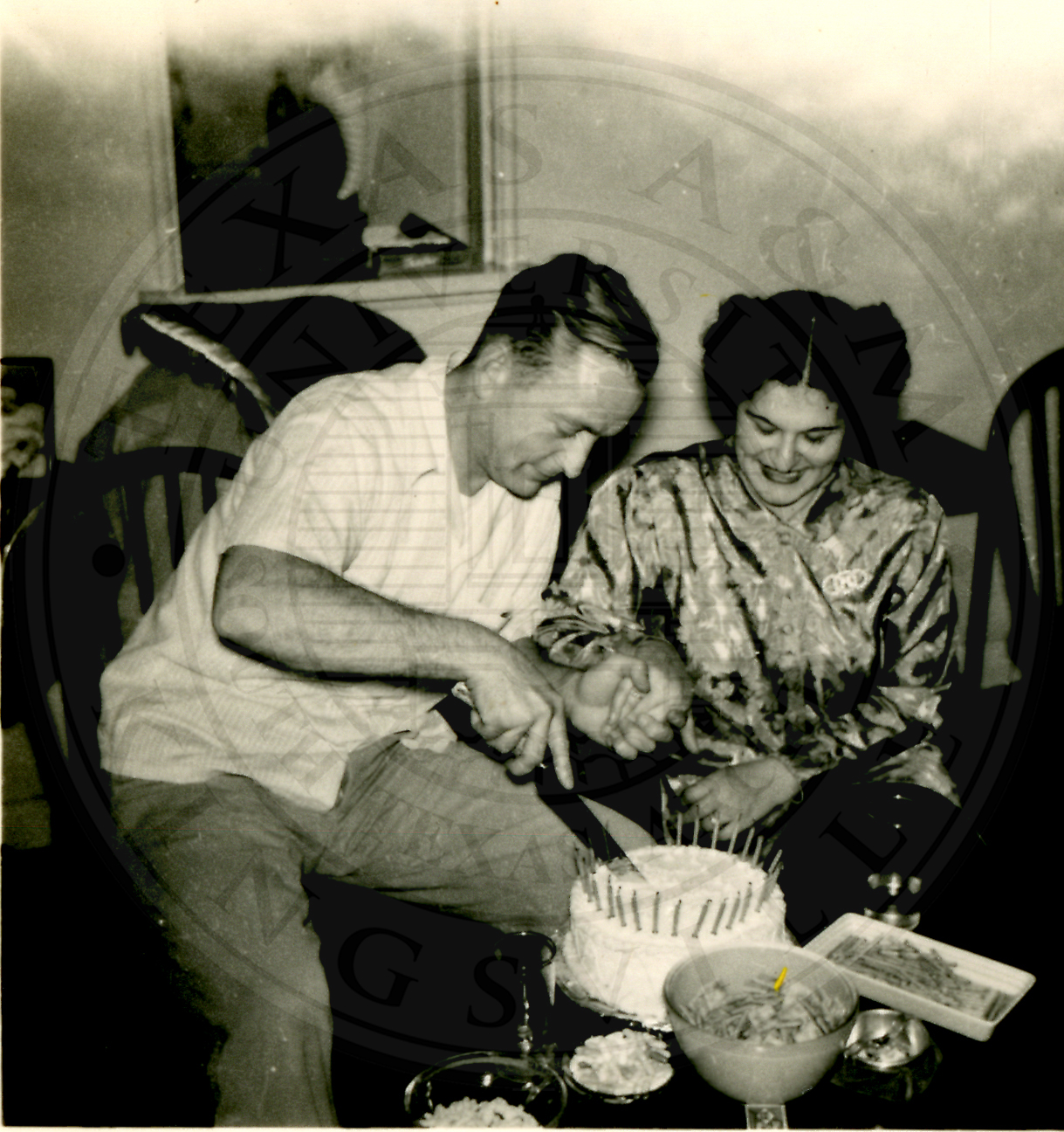 Al Eakin Birthday party. Al Eakin seated and cutting a cake with an unknown woman seated next to him |