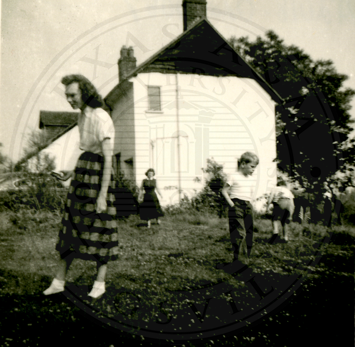 Al Eakin Birthday party. Several unidentified kids outside with an unidentified woman in the foreground |