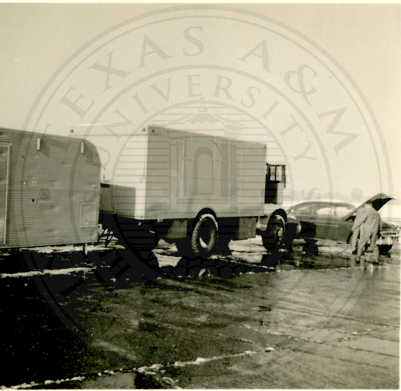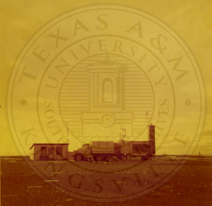 GCA (Ground Controlled Approach) radar unit parked next to a building |