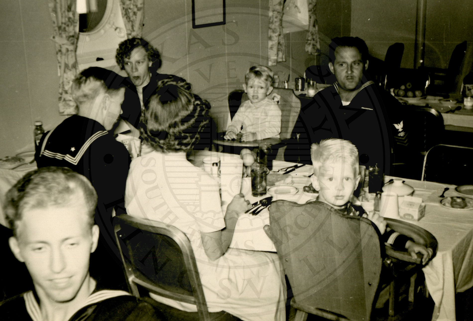 Two unidentified sailors, two unidentified women, and two unidentified boys, one is in a high chair. A third unidentified sailor's head is seen at the bottom of the photo |