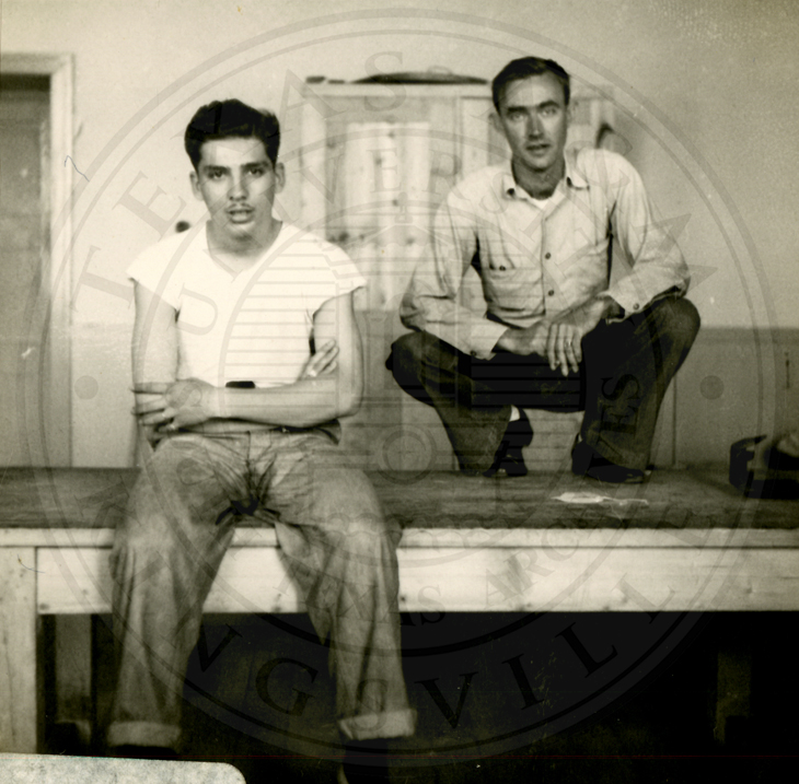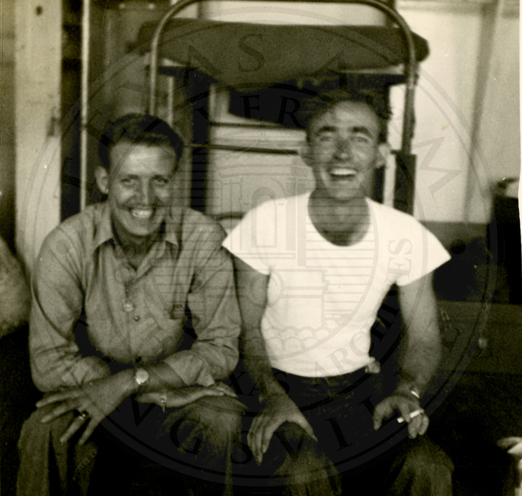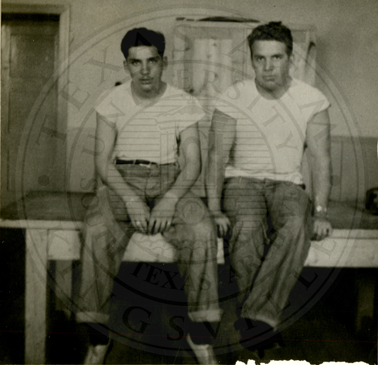Two unidentified men seated next to each other, the man on the right is in an undershirt. They are seated in front of a bunk |