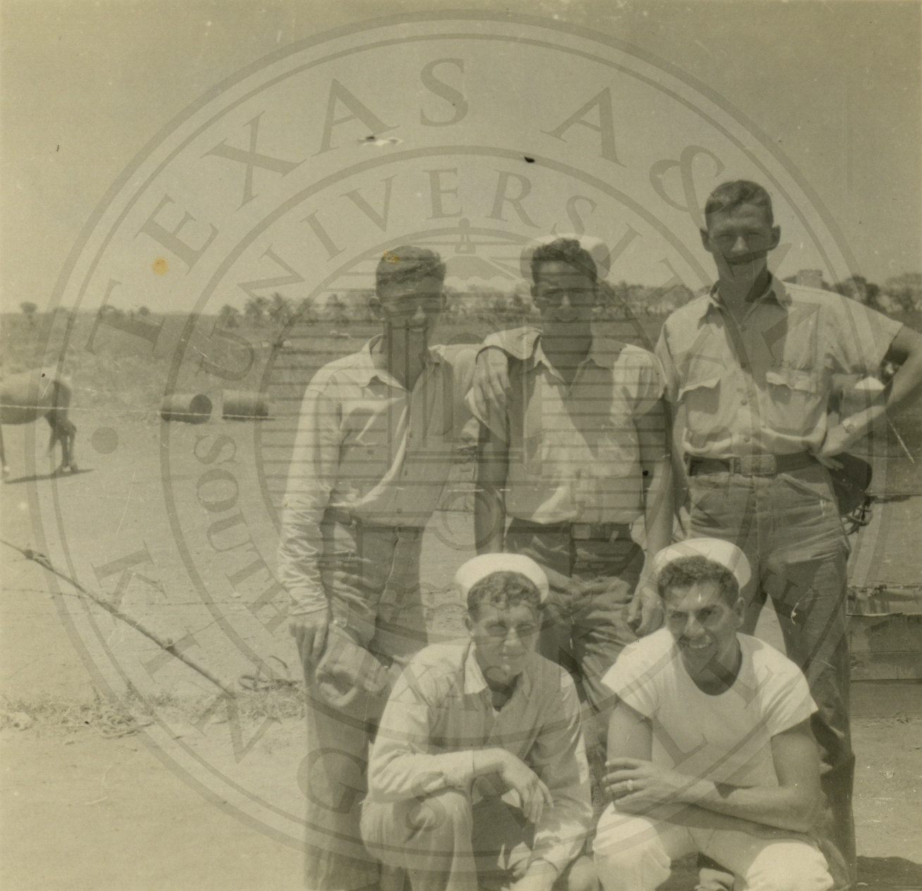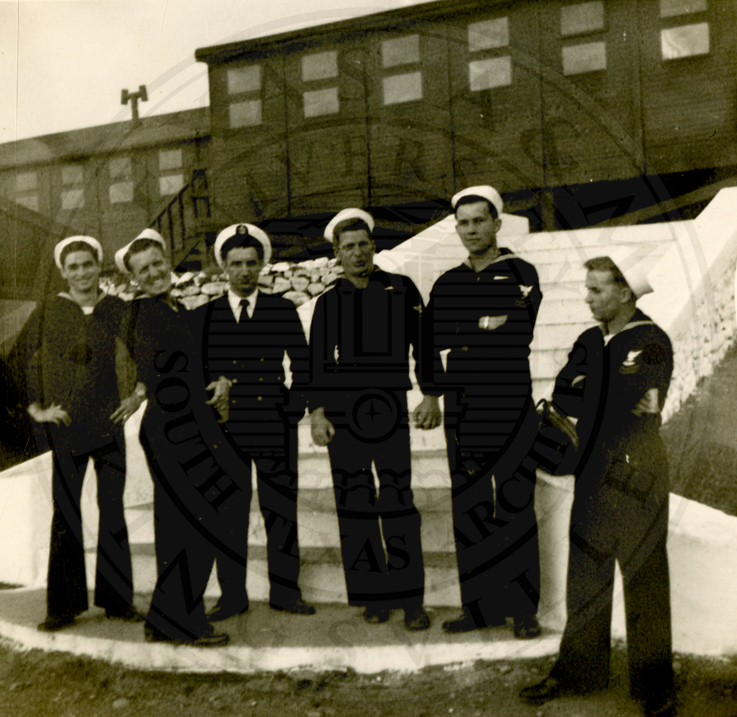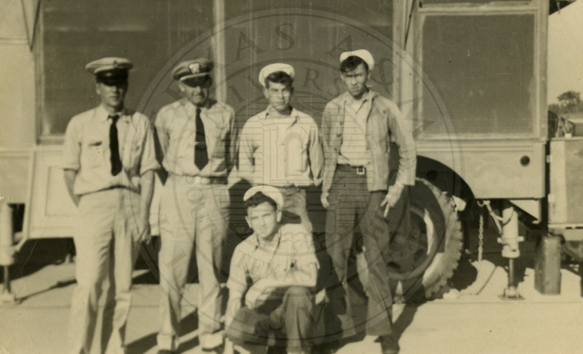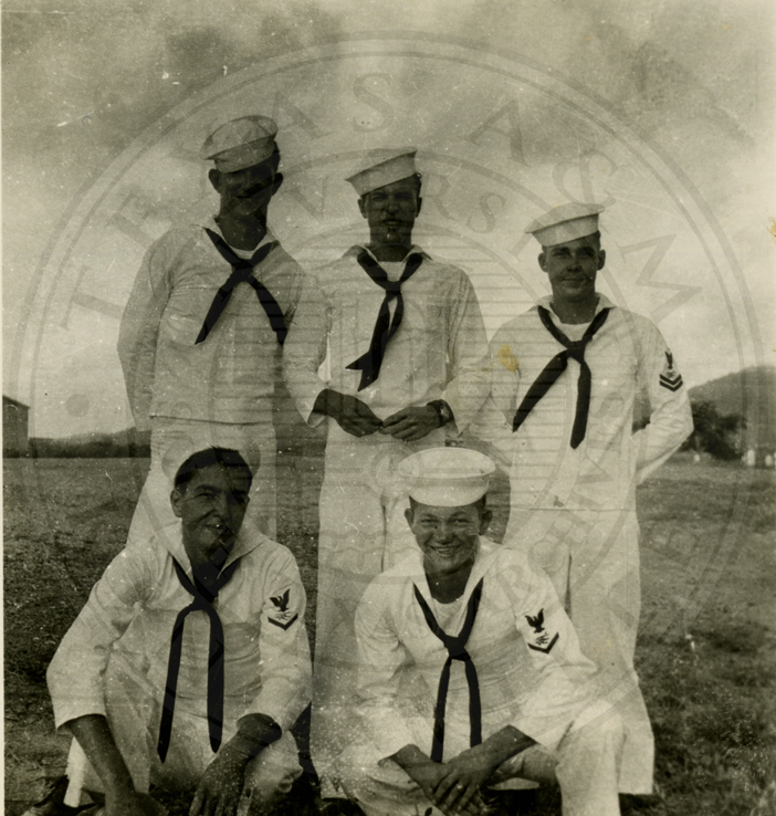 Five unidentified men all wearing Navy uniforms, the writing on back is faded and illegible |