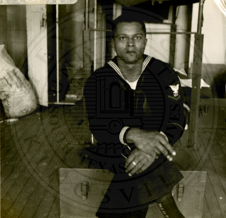 Unidentified African-American sailor seated on a foot locker in front of a bunk |