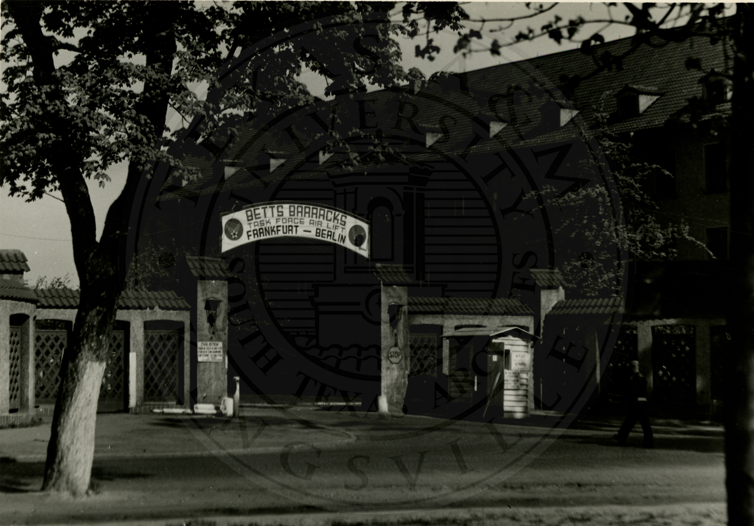Sign reads "Betts Barracks Task Force Air Lift Frankfurt - Berlin" |