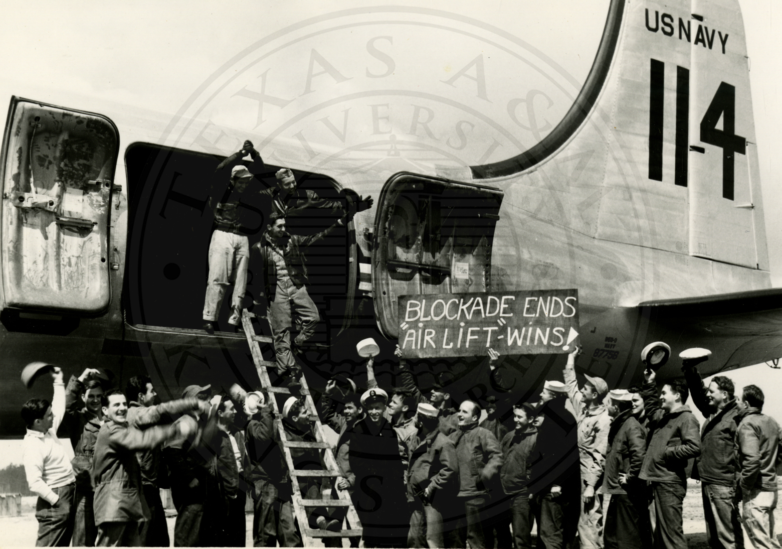 Group of unidentified sailors surrounding a US Navy plan with three airmen coming out of the plan. The men on the ground are holding a sign "Blockade Wins 'Air Lift' Wins" |