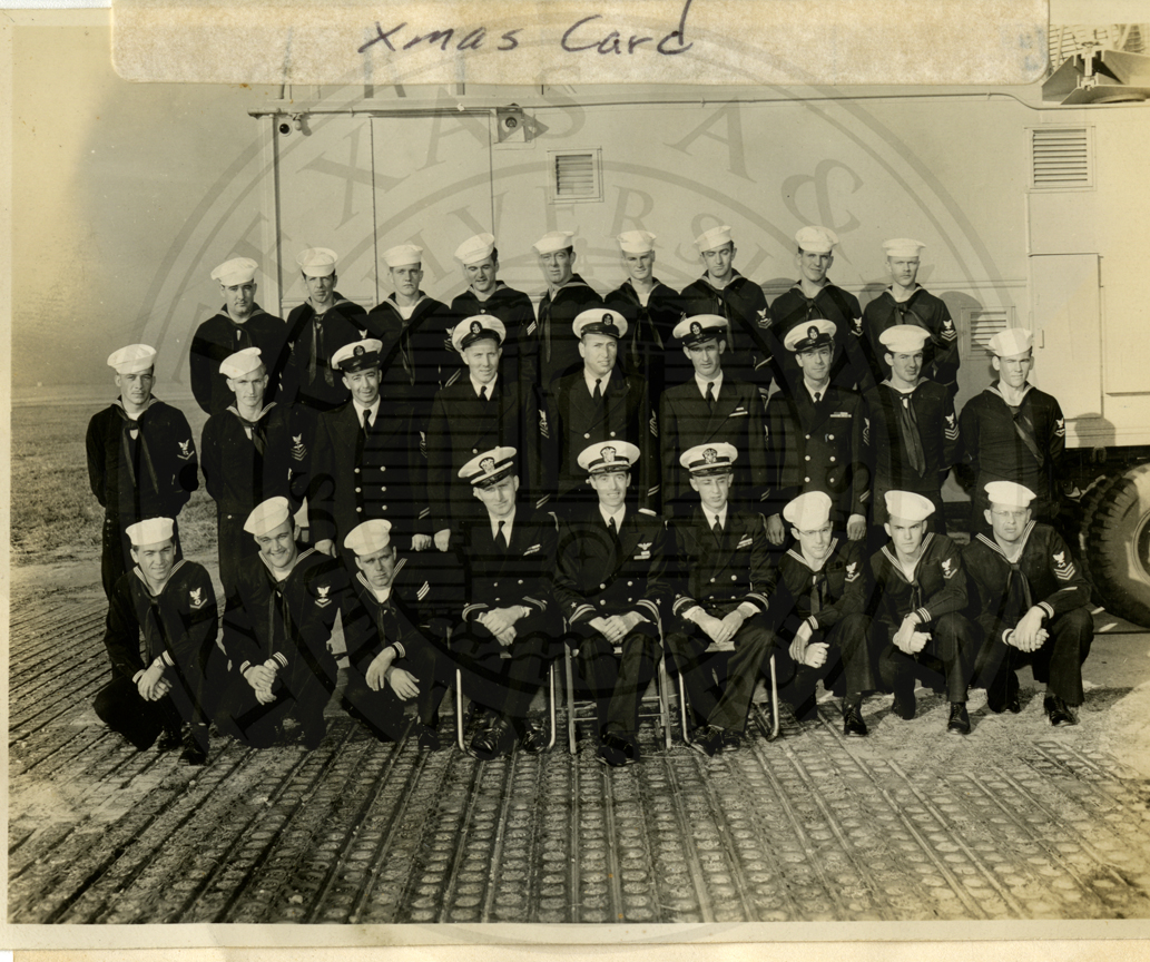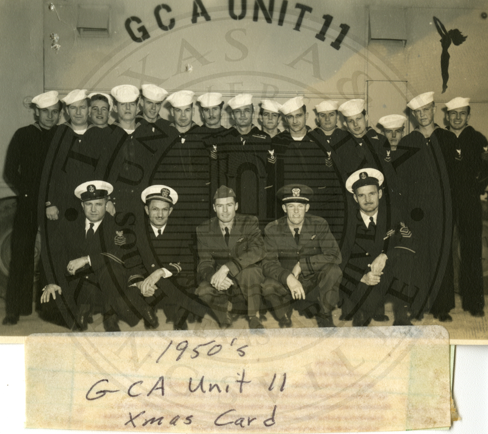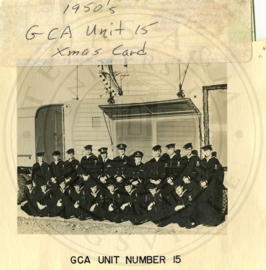 GCA (Ground Controlled Approach) Unit 11 Xmas card. 20 unidentified sailors, front row is kneeling and back row is standing |