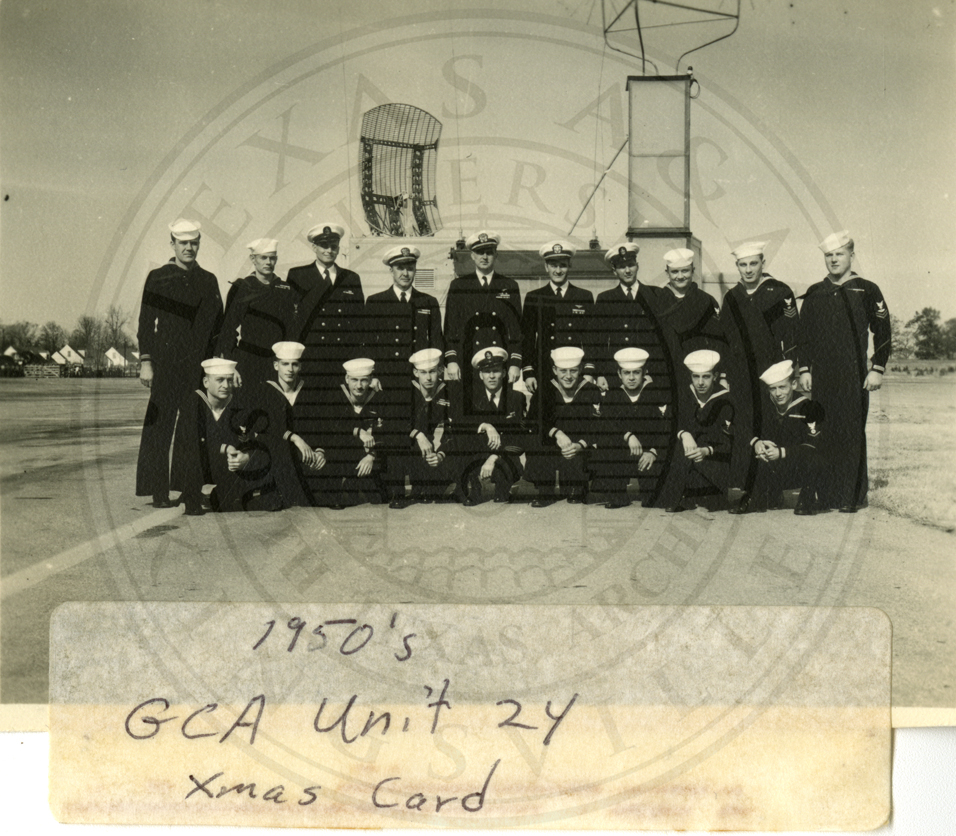 GCA (Ground Controlled Approach) Unit 24 Xmas card, Atlanta Ga. 19 unidentified sailors, the front row is knelling and the back row is standing |