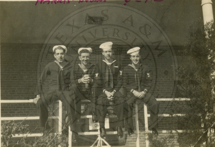 (L-R) Harris, Downs, ?, me (identity unknown). All men are wearing Navy uniforms and are seated on the top railing of a fence |