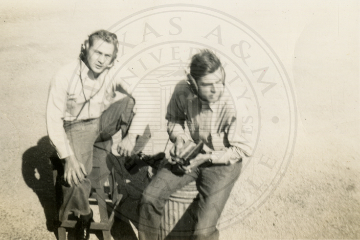 Two men wearing Navy uniforms and wearing headphones. The man on the right is identified as Rayfield, the other is unidentified |