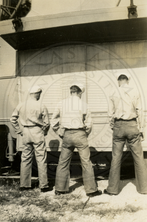 Caption: "Brown tie me" all men are wearing Navy uniforms and are unidentified |