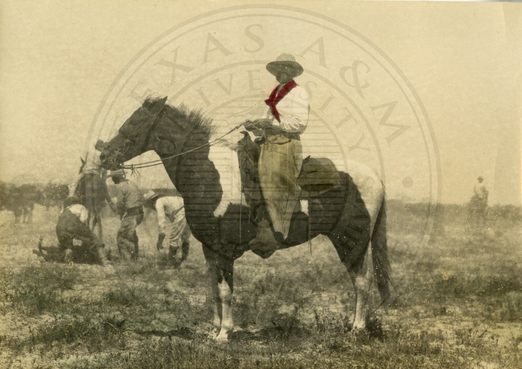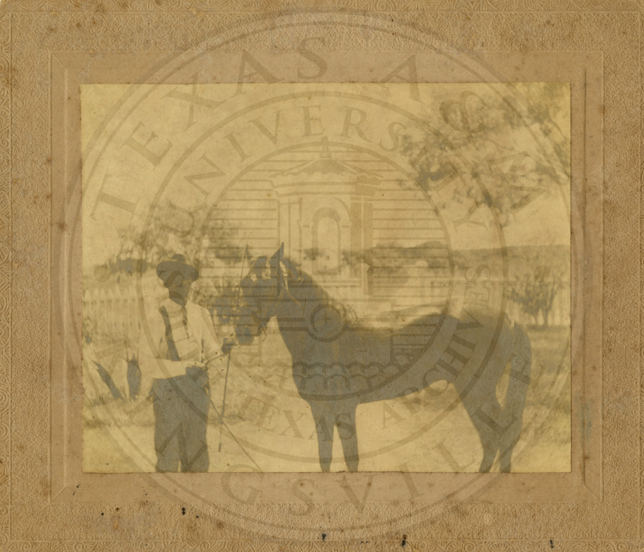 Unknown man wearing a white shirt, tie, and hat holding a horse