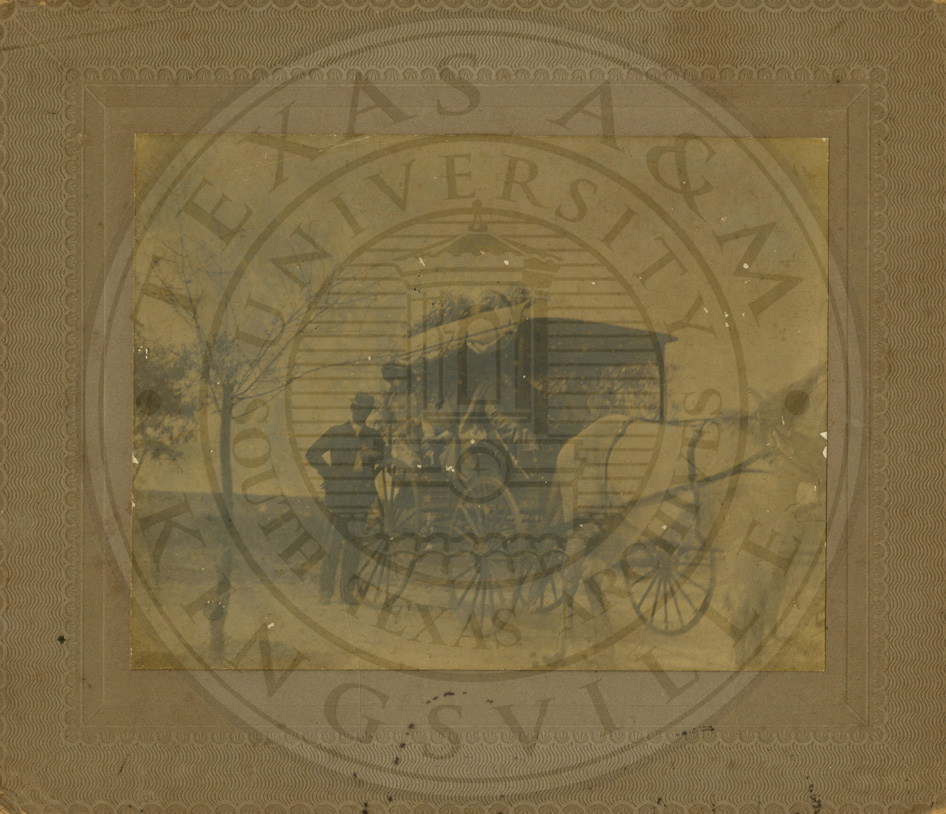 Unknown man standing next to wheel of carriage, and three other unknown persons on top of horse carriage.