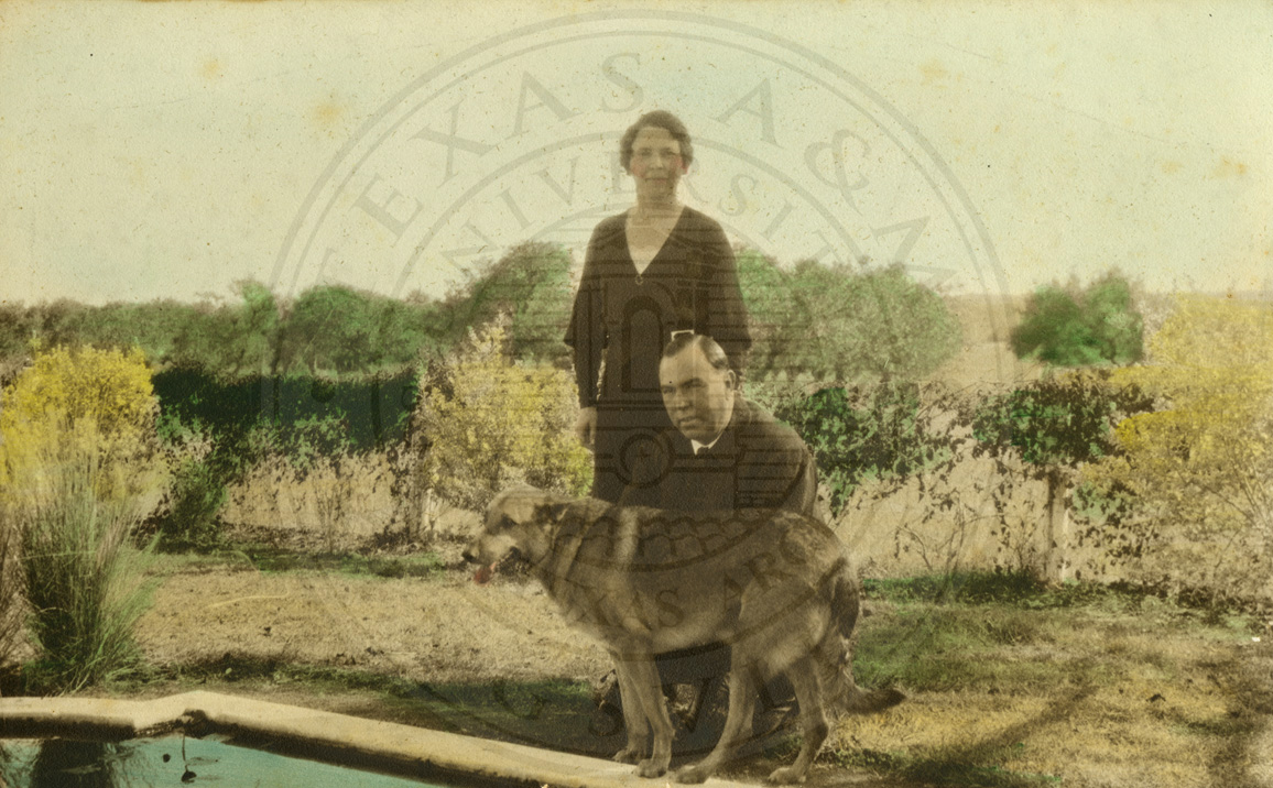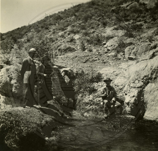 Two unknown men wearing hats, and woman wearing a dark dress and hat beside a pond.