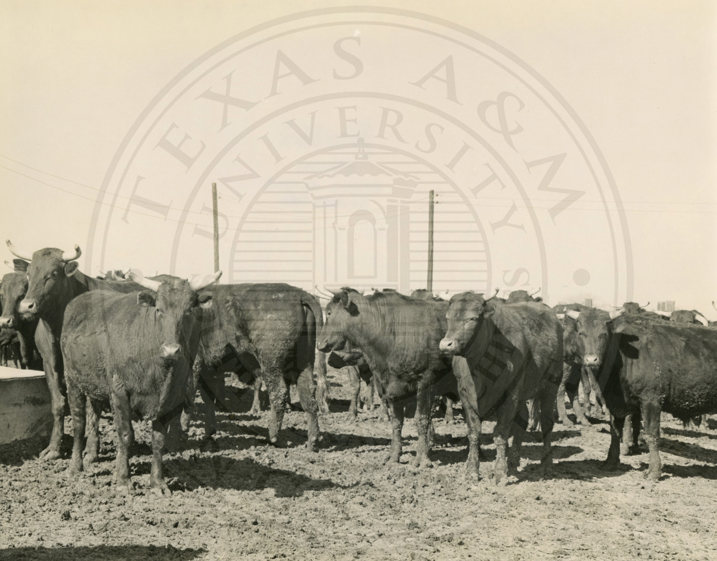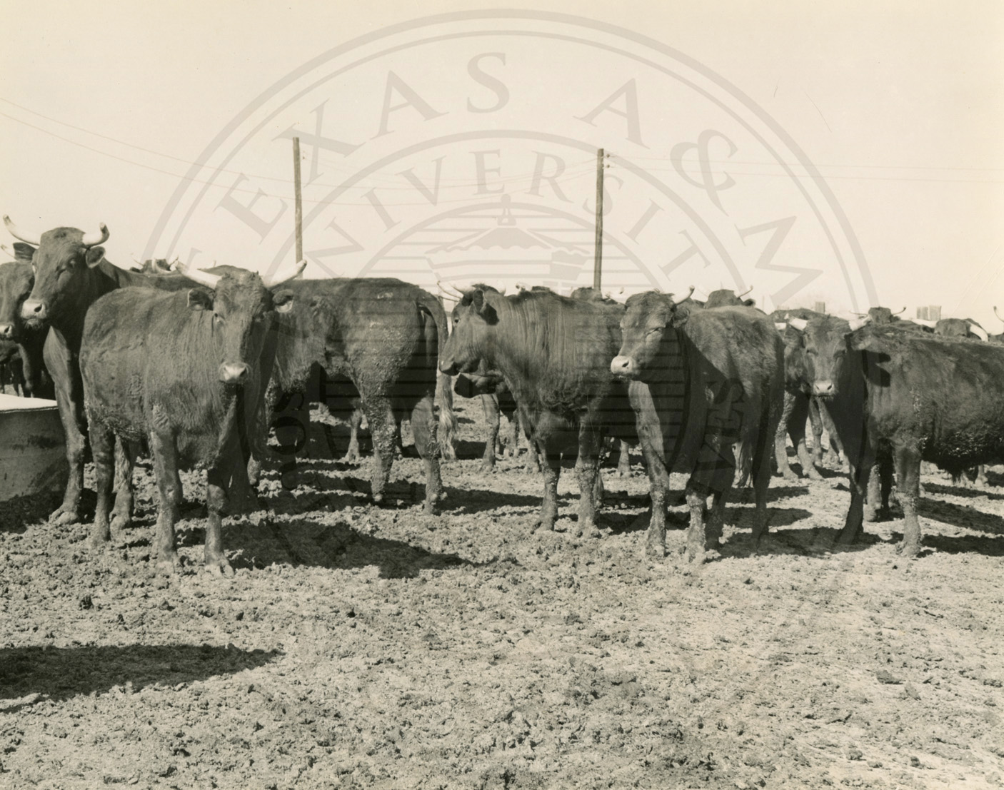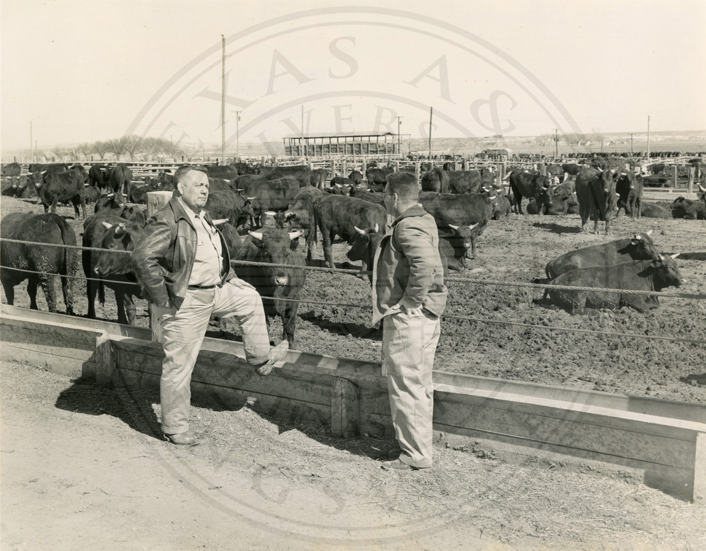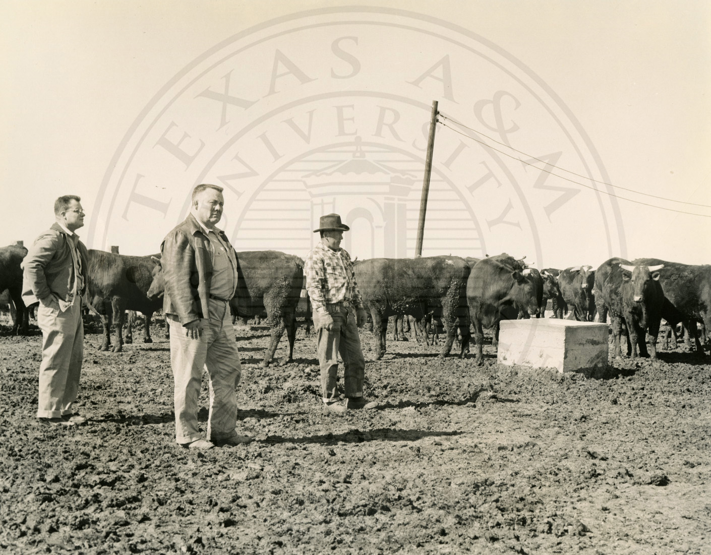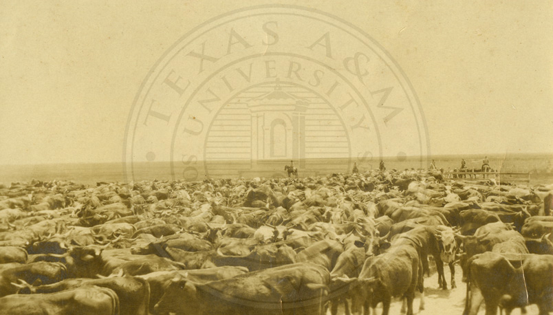 Photo of cattle on an open field; unknown men horse riding on the back.