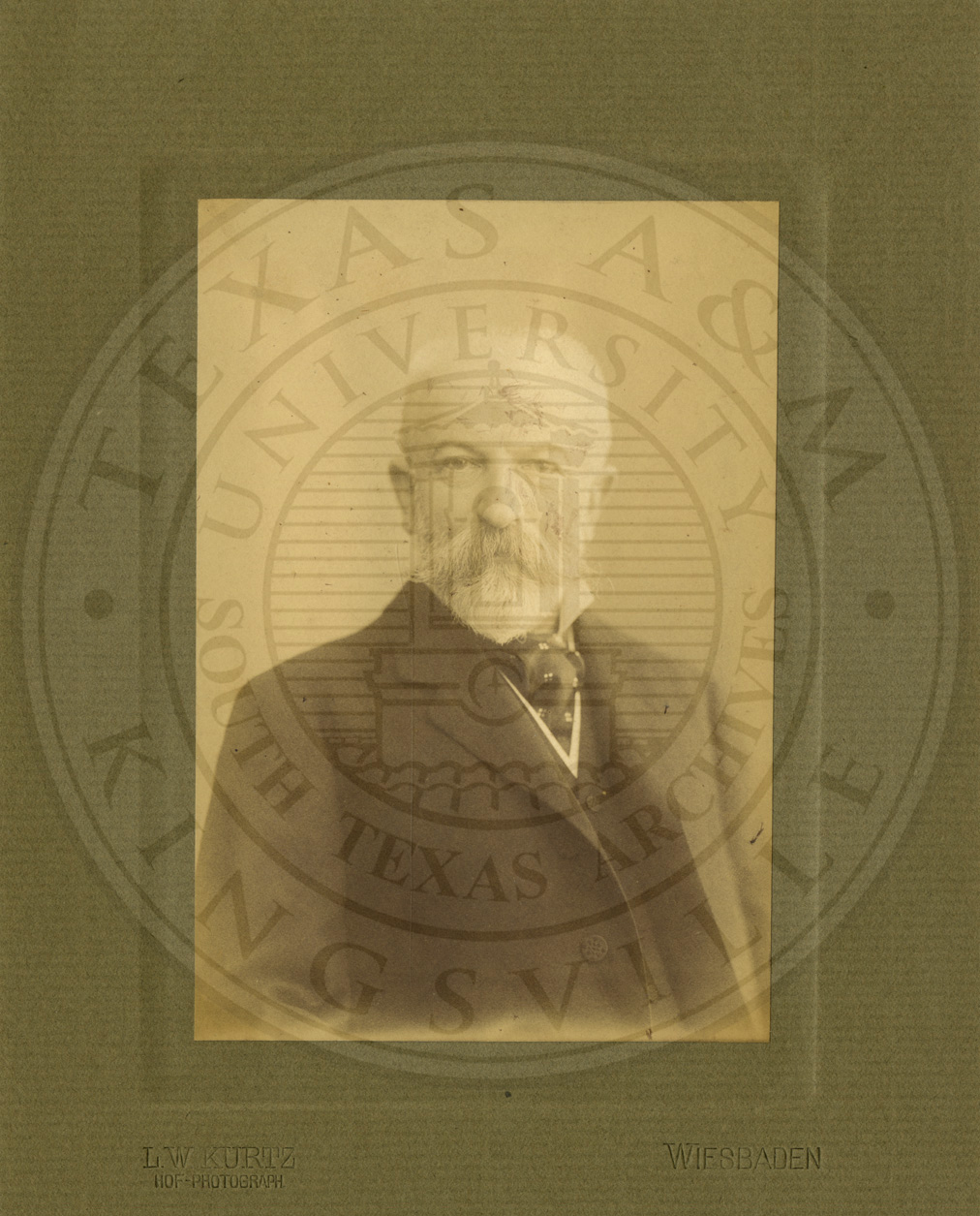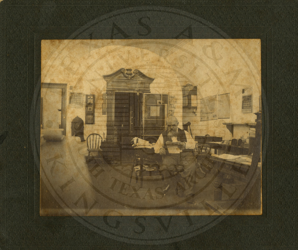 Unknown man (Mifflin Kenedy?) sitting reading the newspaper inside a building.