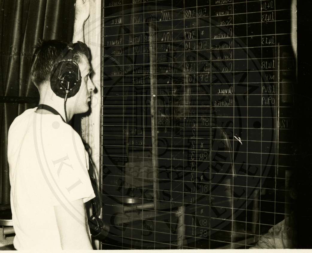 Unidentified man wearing a headset standing in front of a plotting board inside of a GCA (Ground Controlled Approach) radar room |