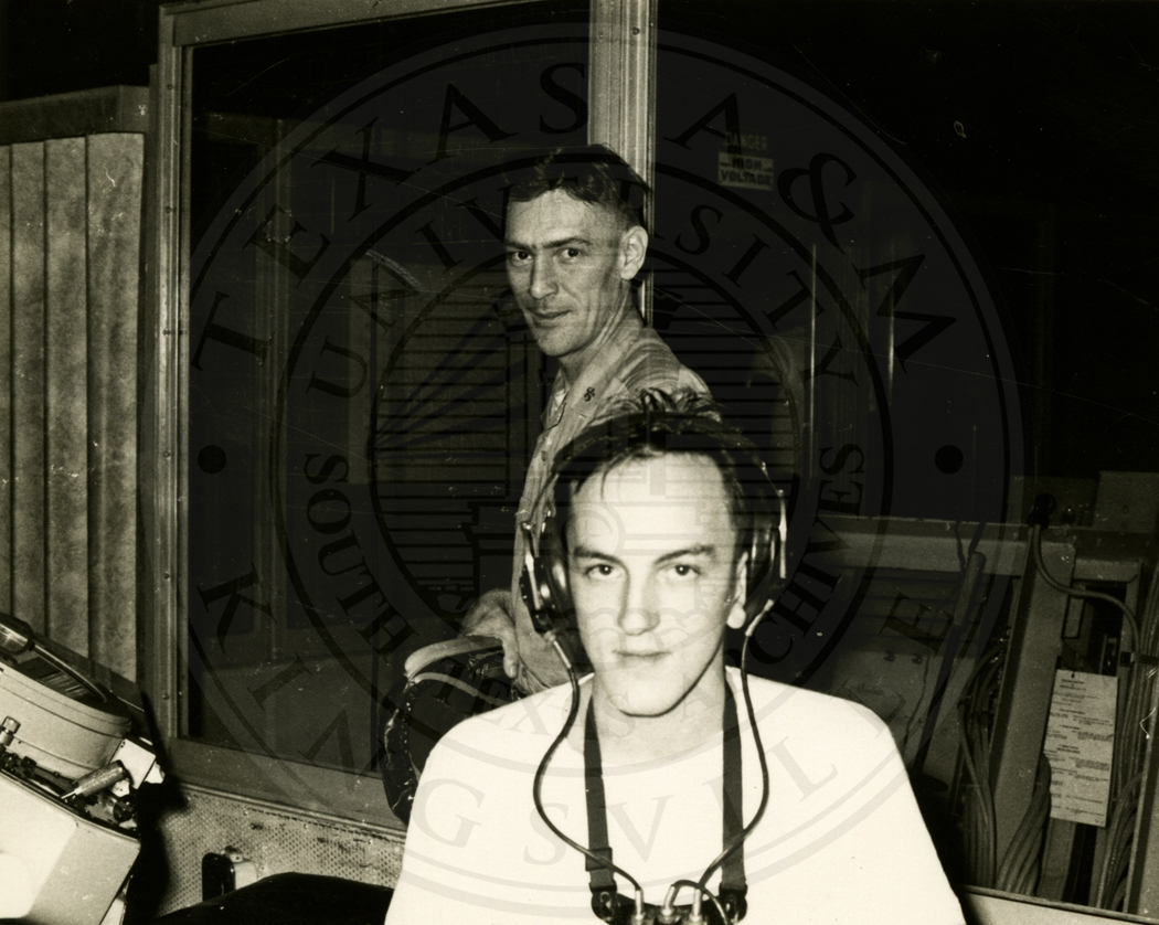 Two unidentified men wearing a Navy uniform. The man in the foreground is wearing a headset and is sitting, the other man is standing behind him inside of a GCA (Ground Controlled Approach) radar room |