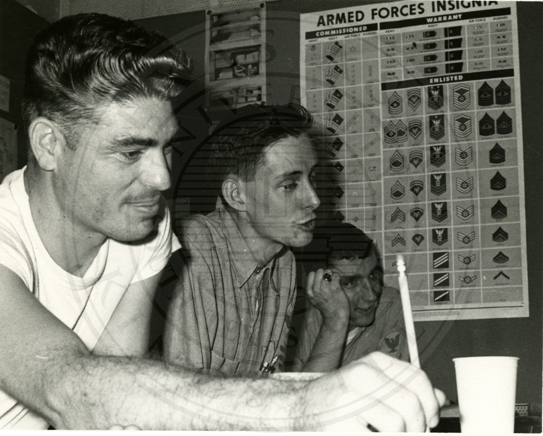 Caption: "(L-R) B. Downs, G. Stevenson, W. Mastrangeli. GCA Unit 15, Argentia, Newfoundland" |