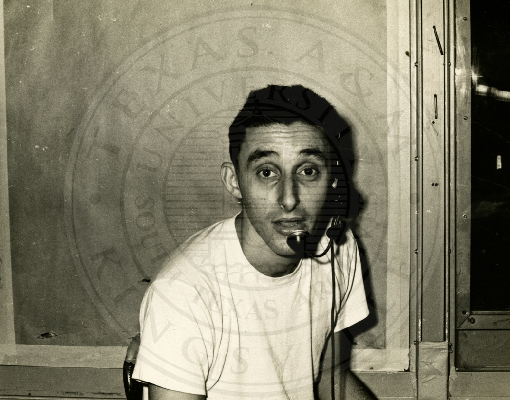 Unidentified man wearing a headset seated inside of a GCA (Ground Controlled Approach) radar room |