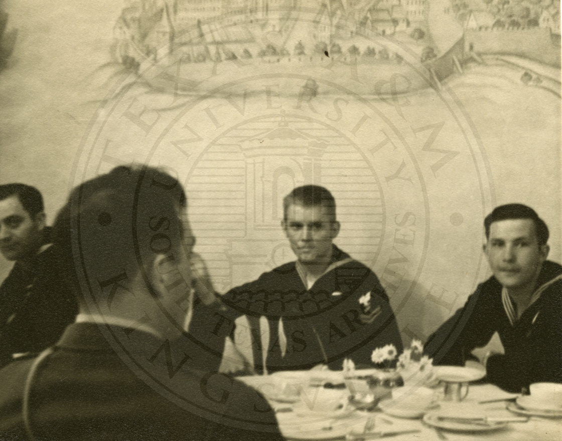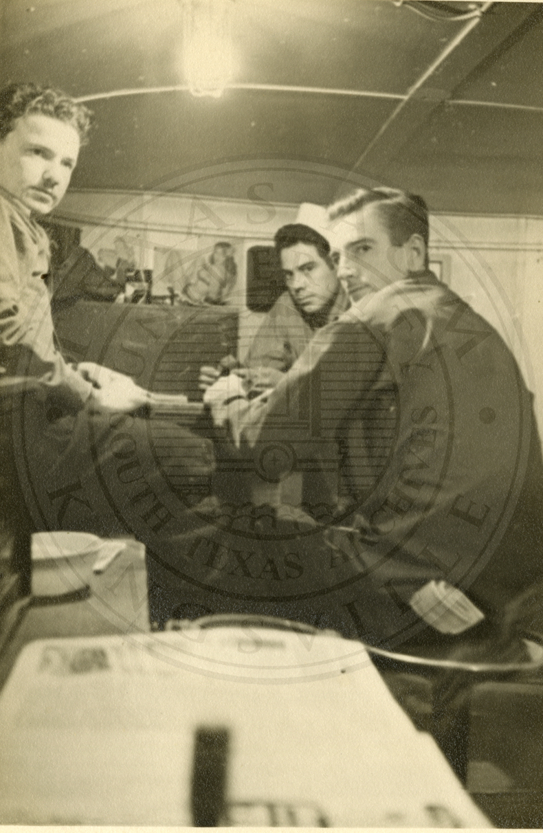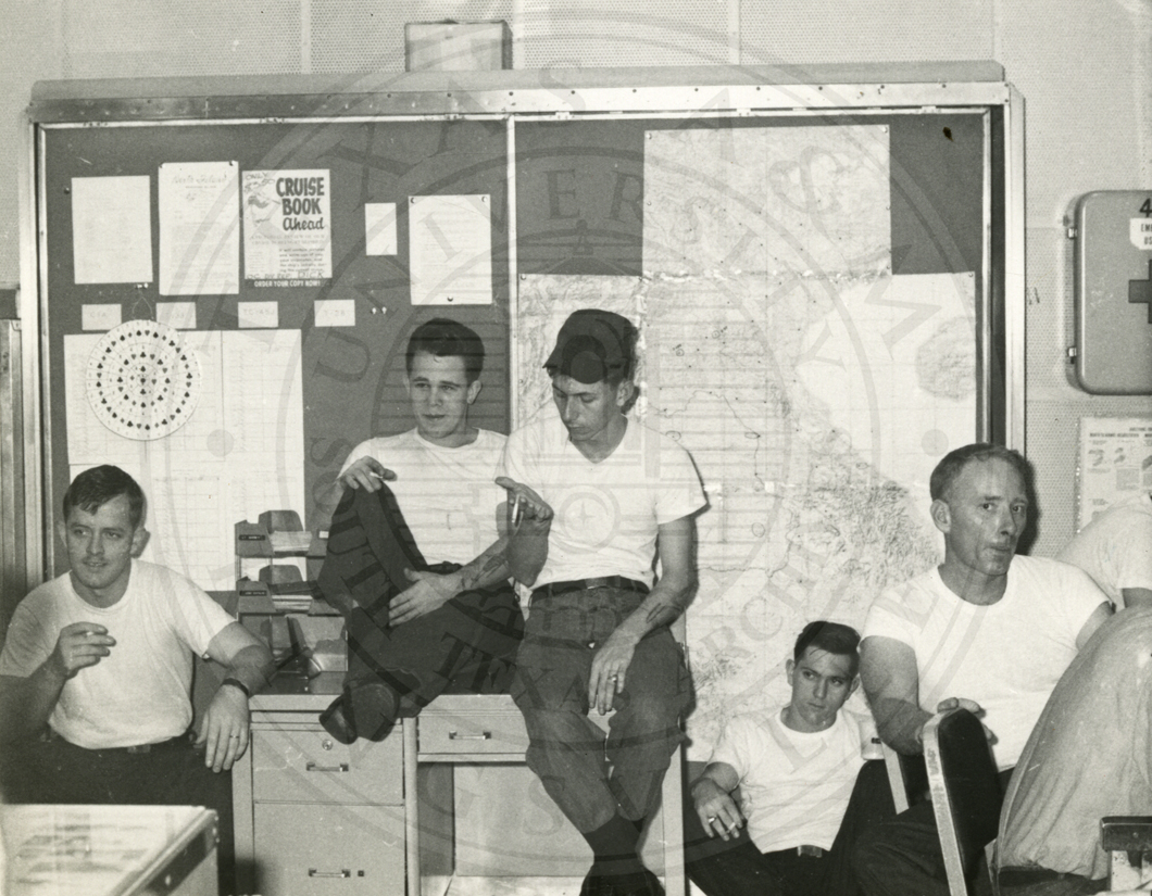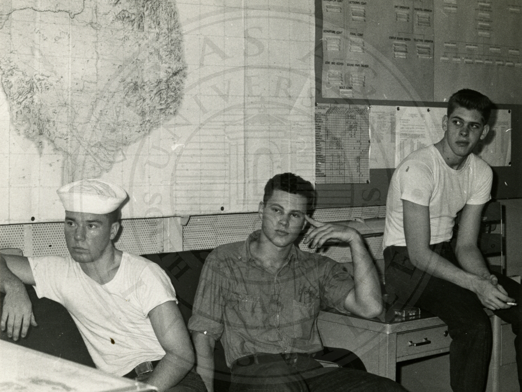 Three unidentified men, two in Navy uniforms, are seen through a plotting board |
