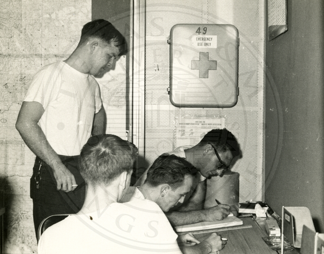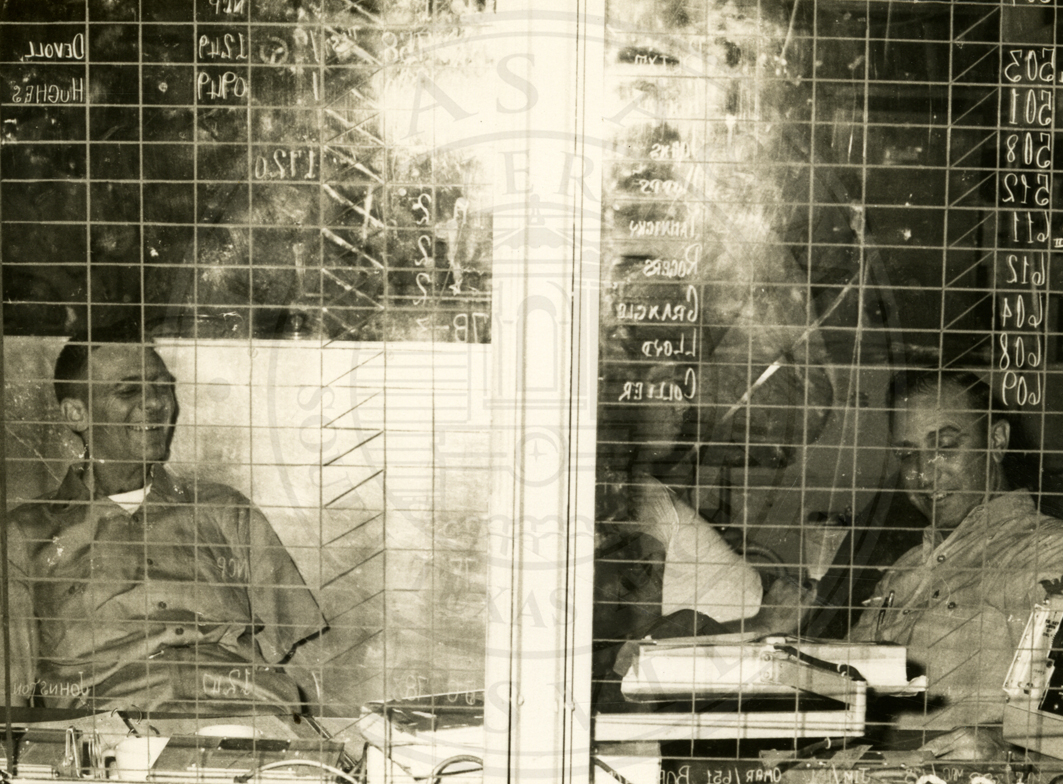 Three unidentified men sitting inside of a GCA (Ground Controlled Approach) radar room |