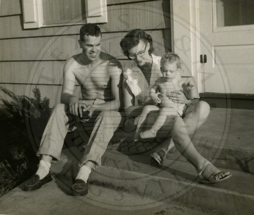 Unidentified man and woman sitting outside on a porch step. The woman is holding a baby on her lap. Caption: "Summer, Olathe, KS" |