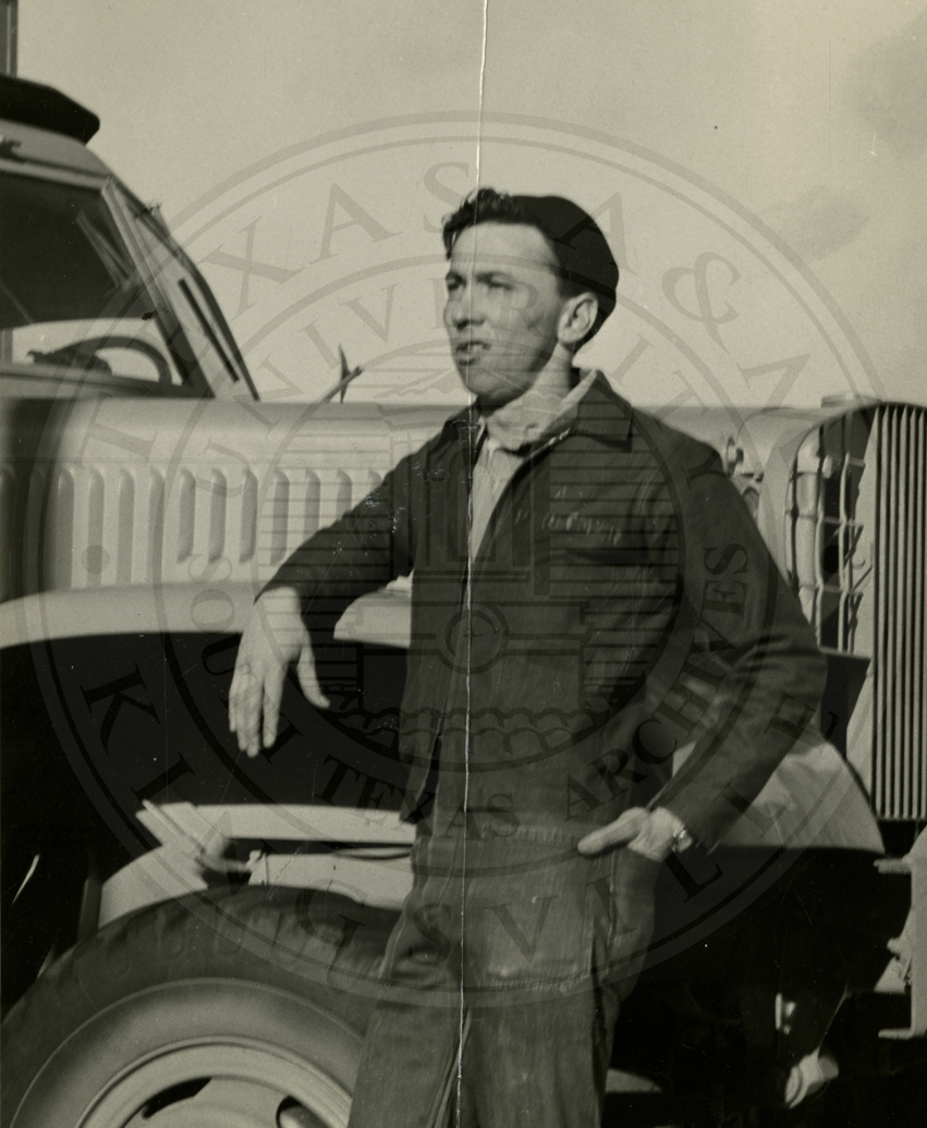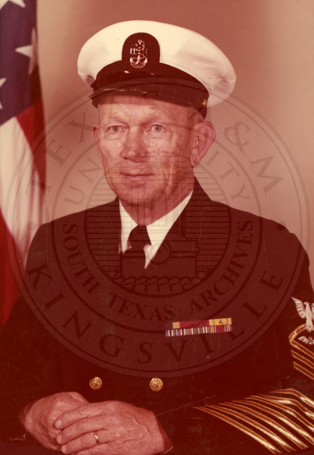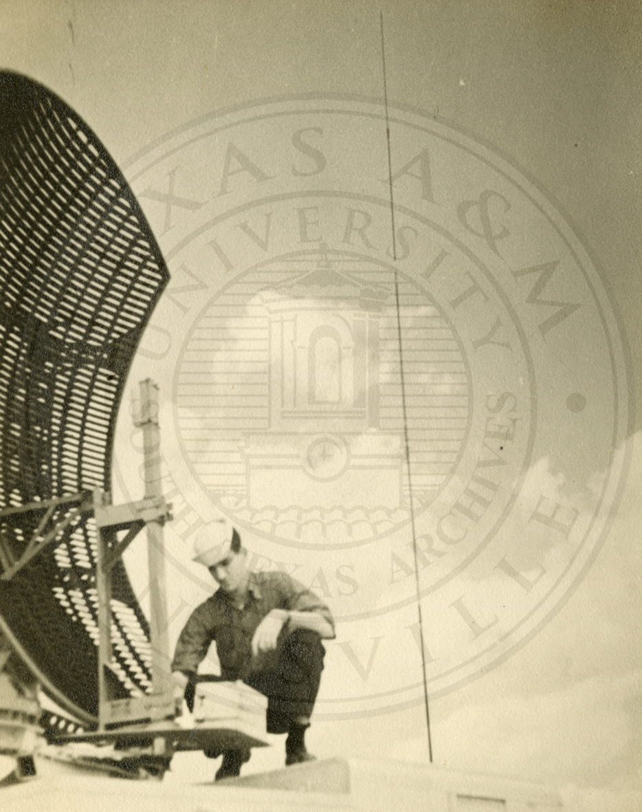 Unidentified man wearing a Navy uniform kneeling in front of a radar unit |