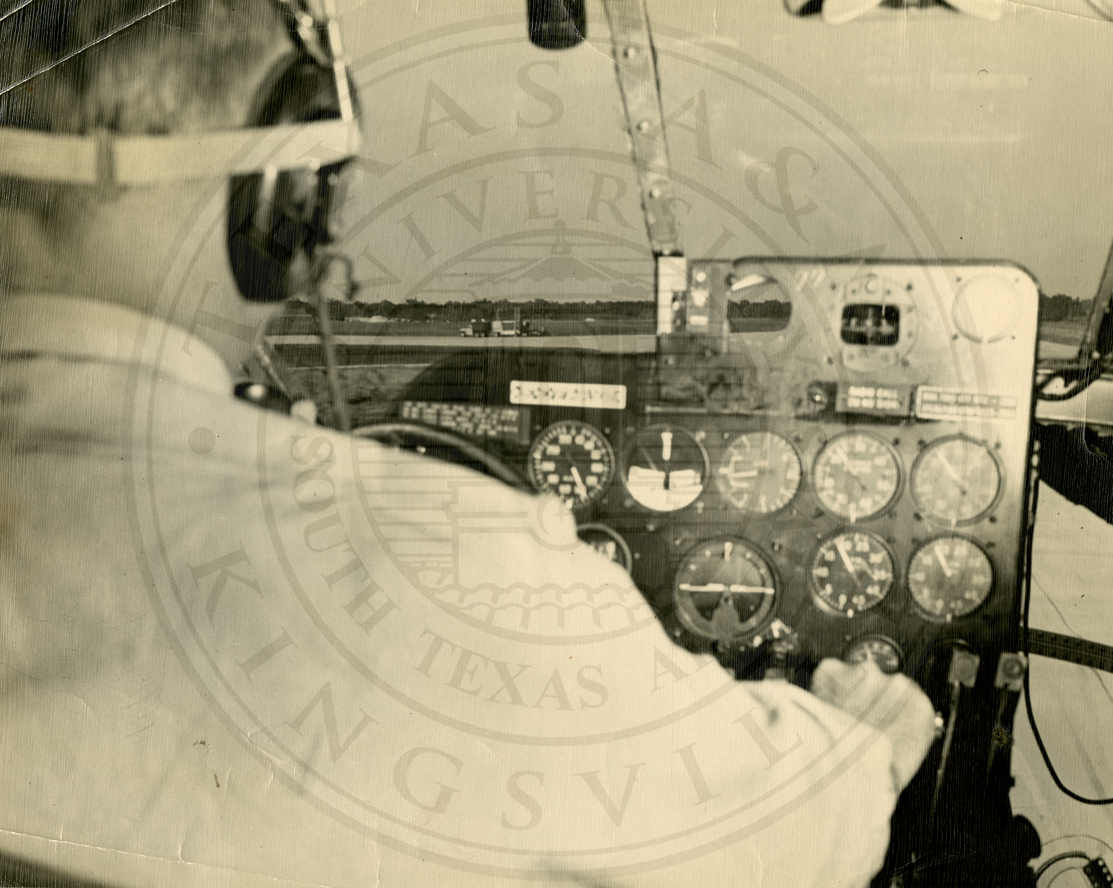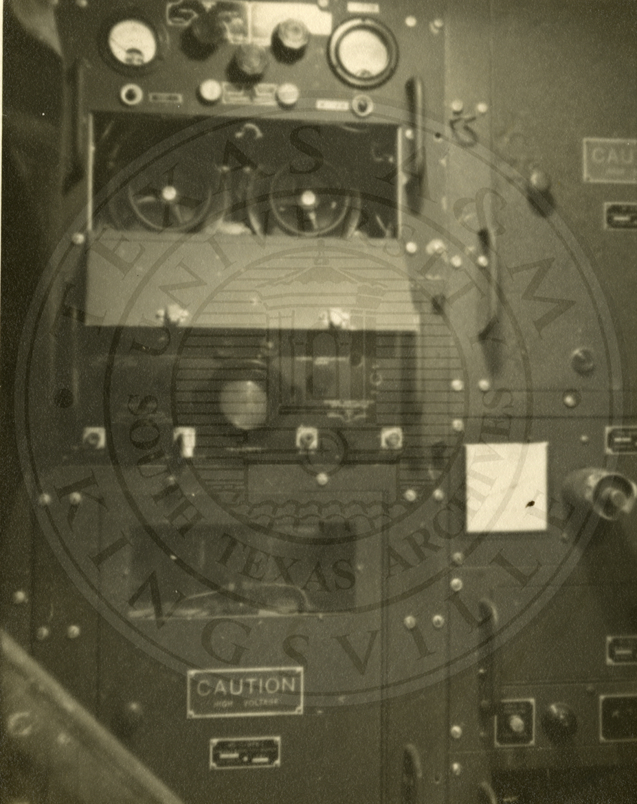 Over the shoulder view of a control panel of an unknown vehicle. A GCA (Ground Controlled Approach) radar unit can be seen in the background |