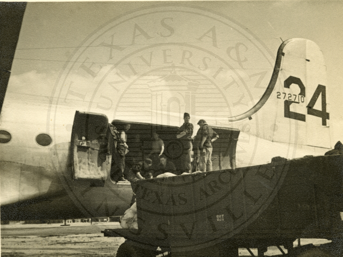 Caption: "This is a loading crew loading an Airlift 'Skymaster' with flour for Berlin" |