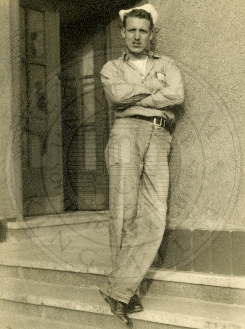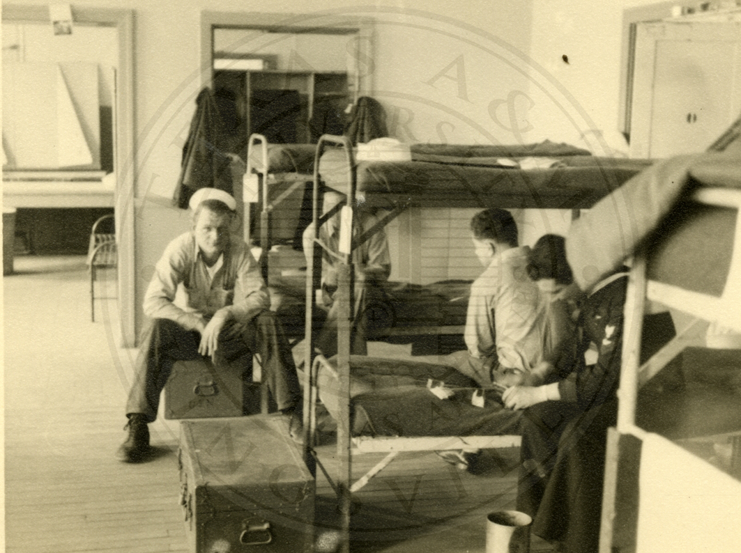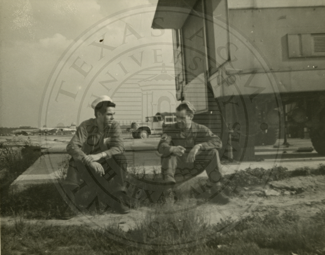 Two unidentified sailors sitting outside of a GCA (Ground Controlled Approach) radar unit |