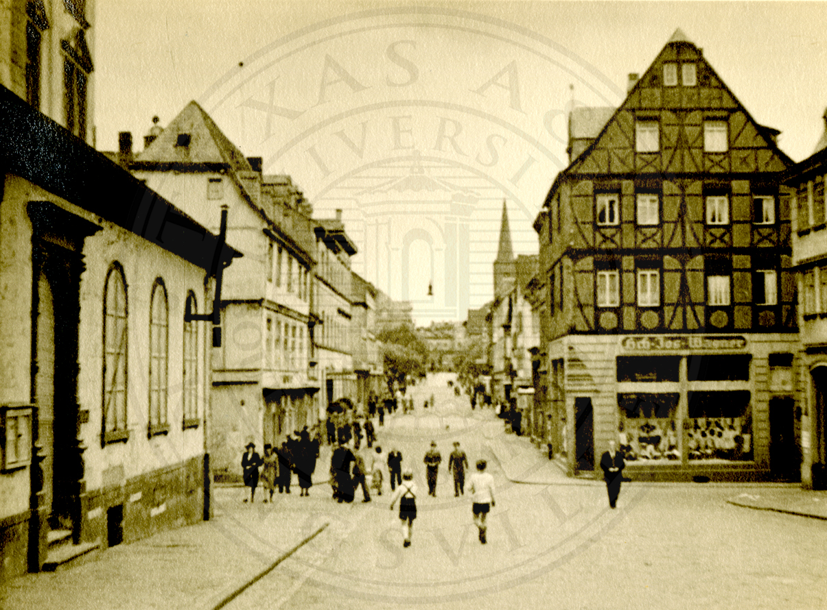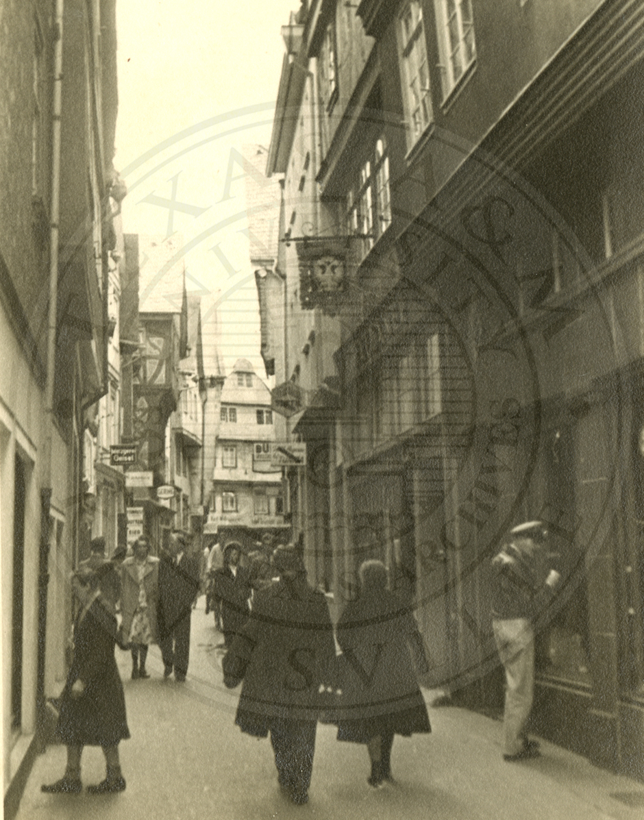 Unidentified people walking along a narrow street with shops on each side. Unknown city |