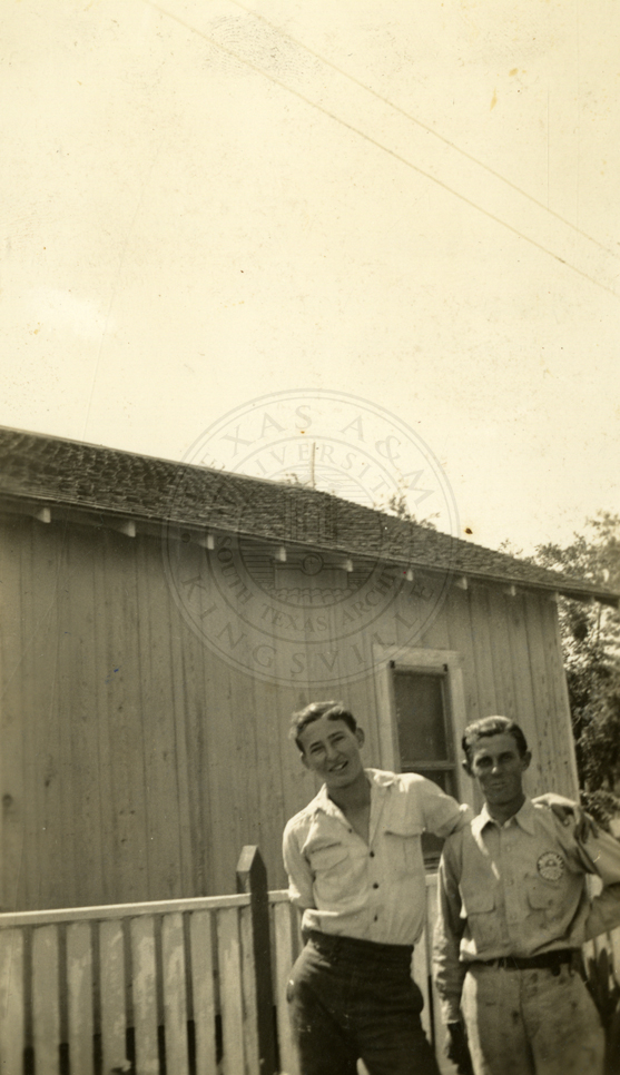 William T. Acklin and Samuel Benavides, standing in front of a home in Hebbronville, Texas. 1920s. |