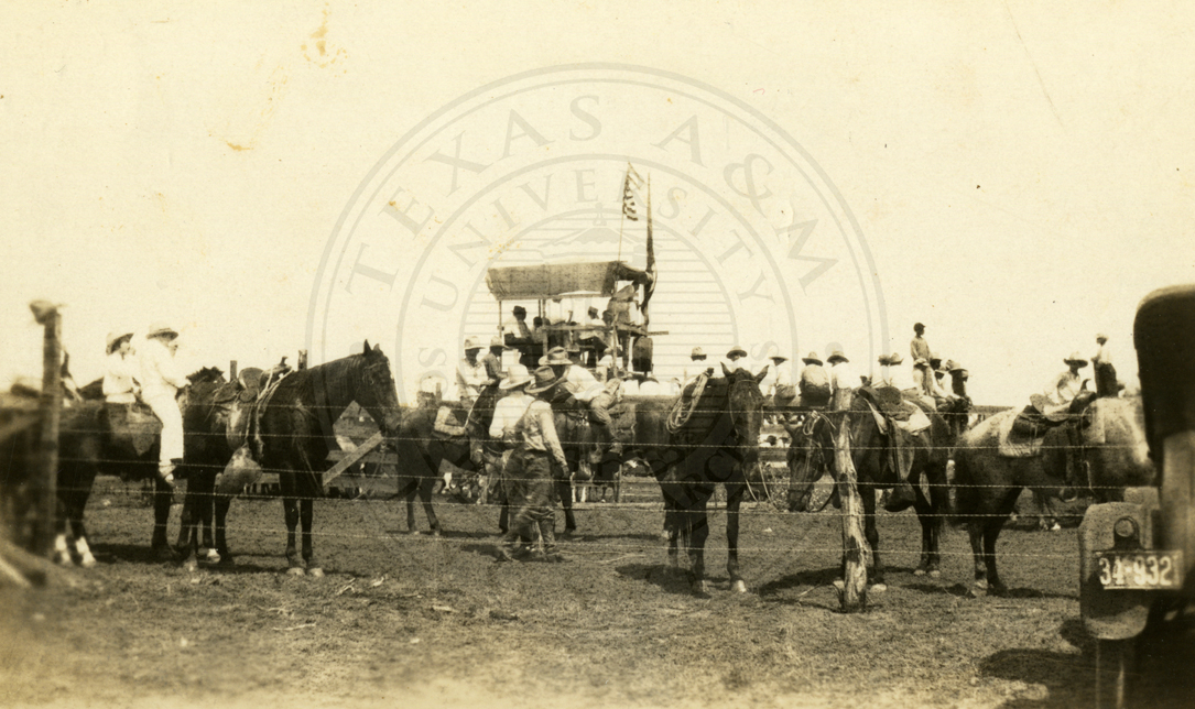 An unidentified group of cowboys on horseback, with a stand in the background. Appears to be at a rodeo |