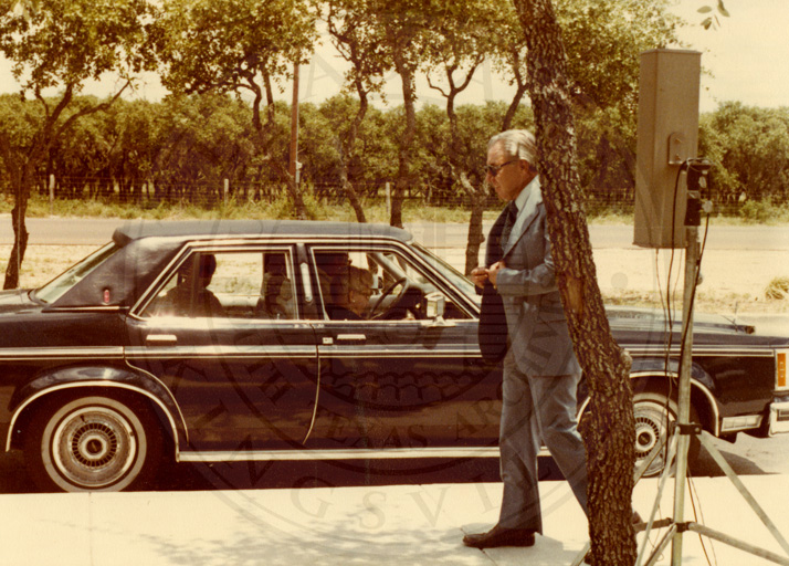 Unidentified man in a gray suit, next to a black car with three women inside