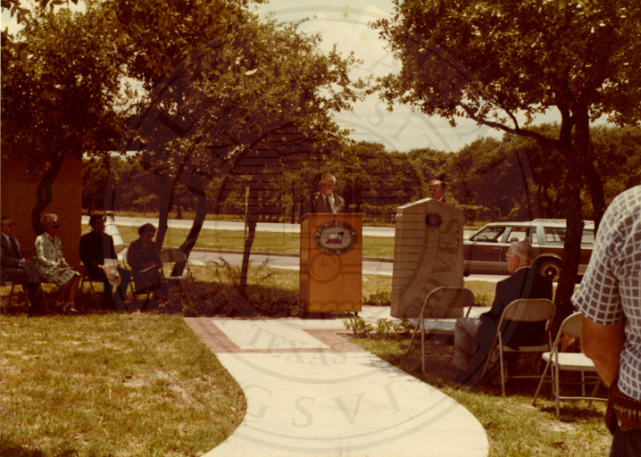 Unidentified man in a gray suit talking in stand, and men and women sitting on the back