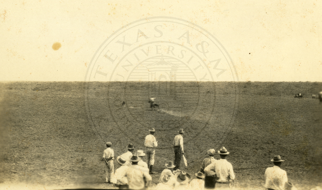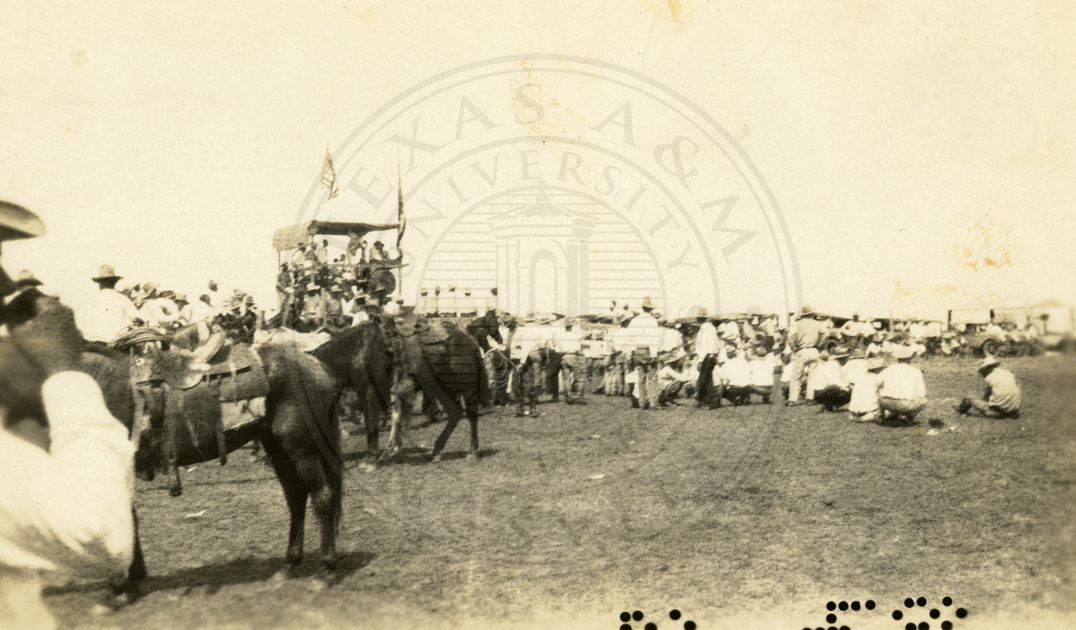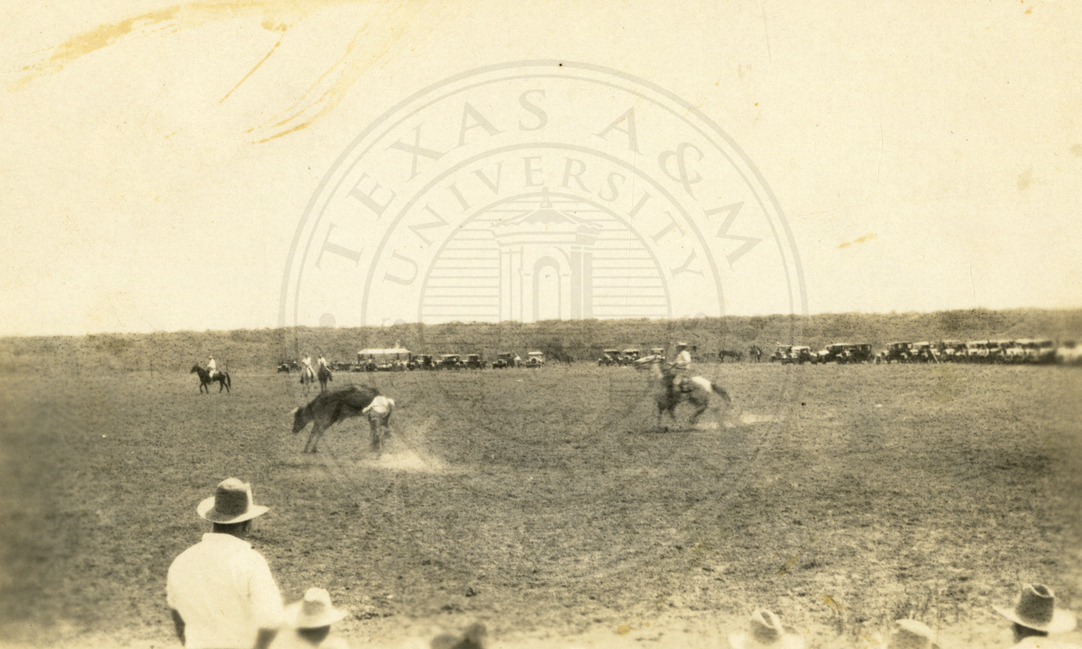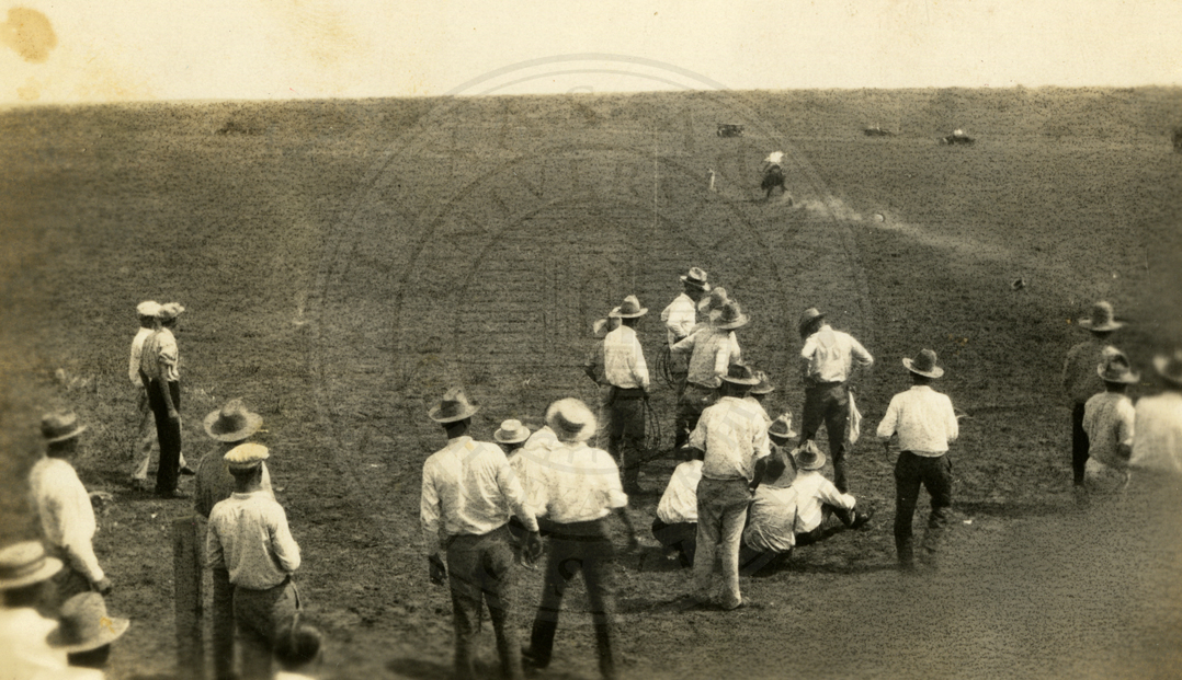 An unidentified group of cowboys participating in events at what appears to be a rodeo. 1920s. |