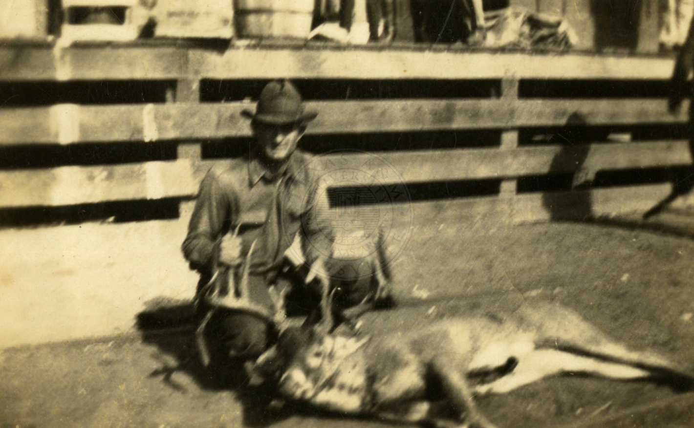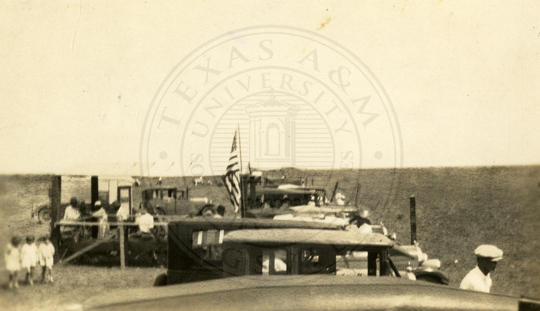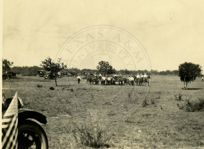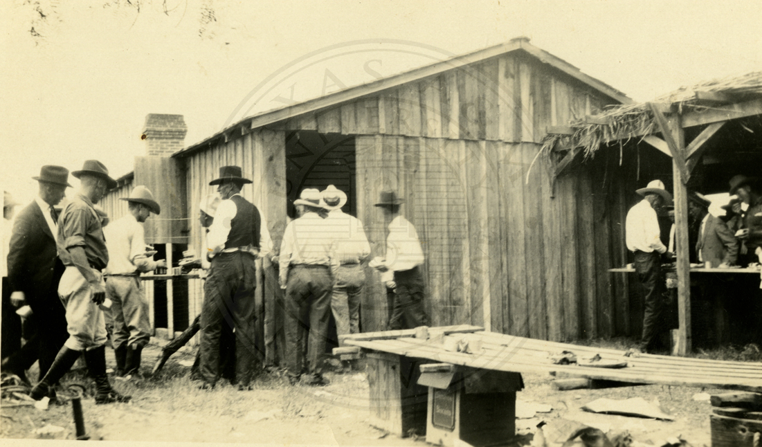 An unidentified group of cowboys watching events at what appears to be a rodeo. 1920s. |