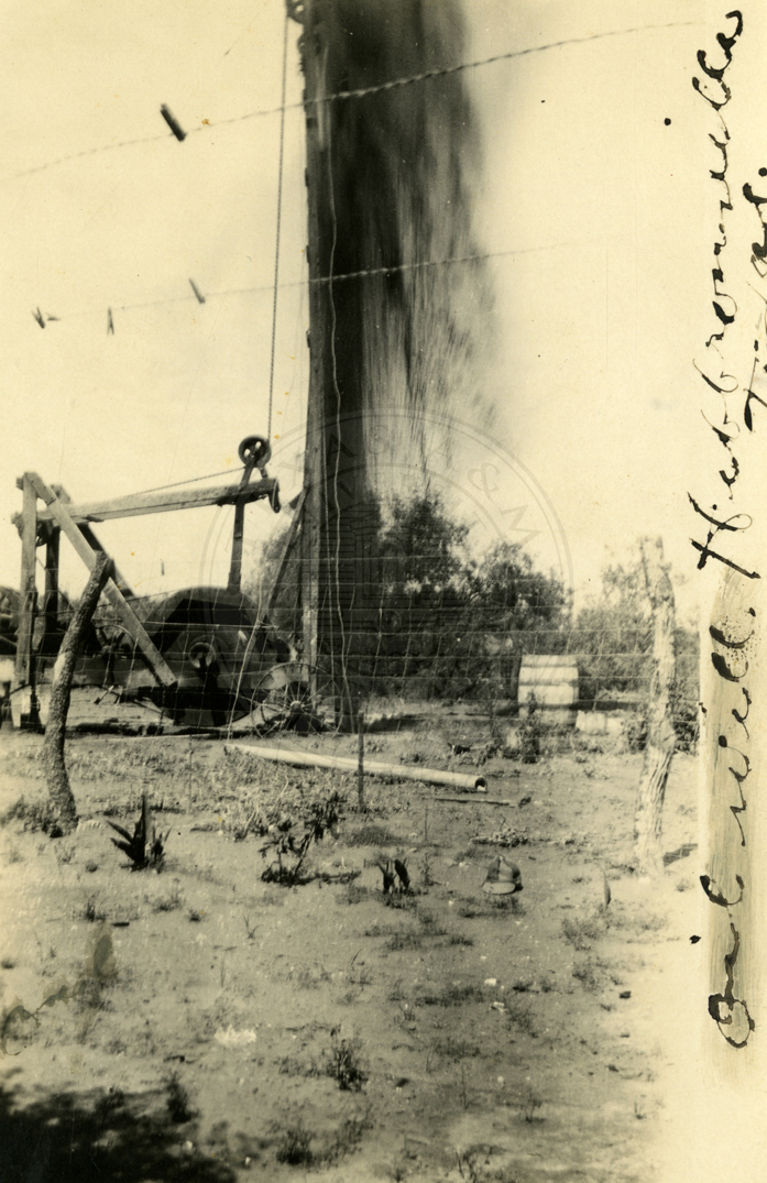 An oil well, gushing crude oil. |