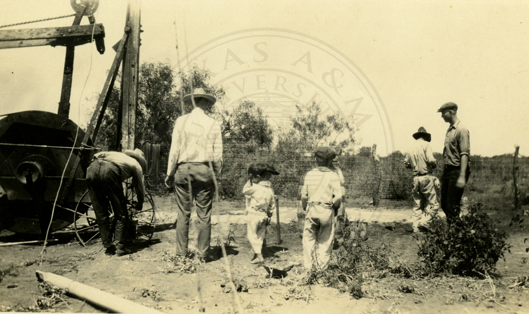An unidentified group of men and children looking on as an oil well is drilled. |