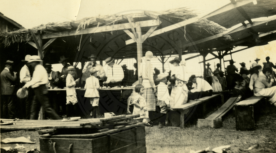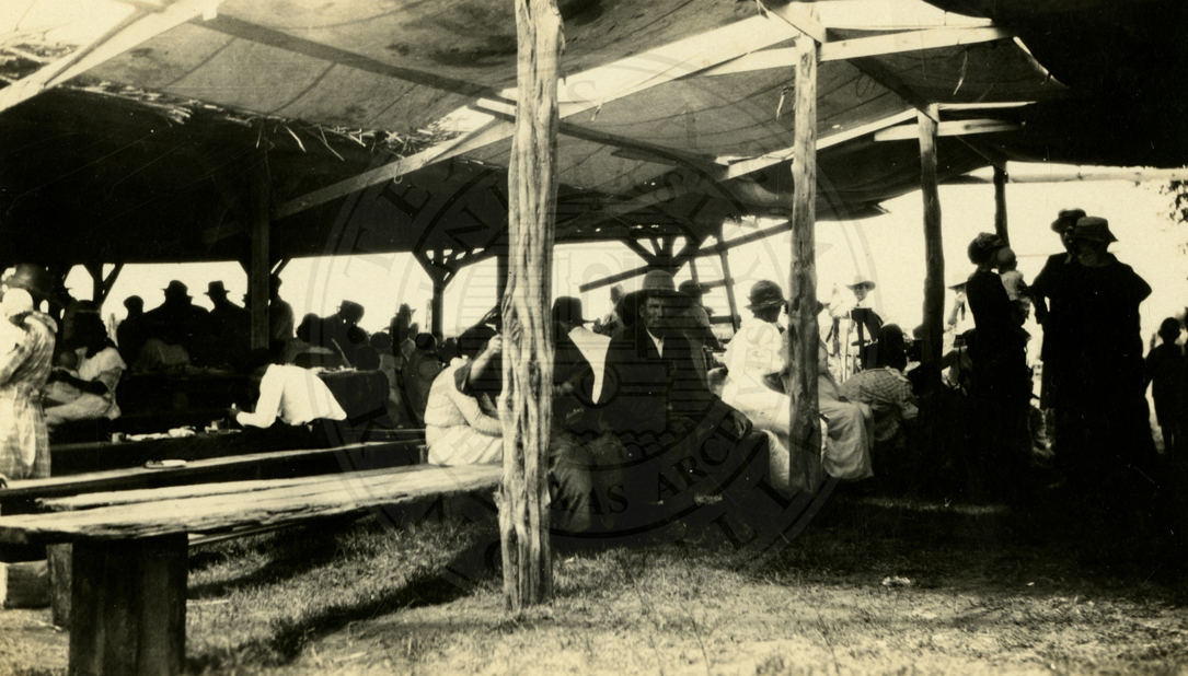 Unidentified group of men and women seated under an outdoor awning. Appear to be at a barbecue. |