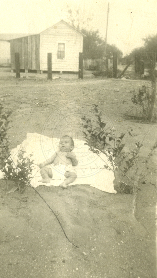 Unidentified infant on a blanket in front of a small house. |