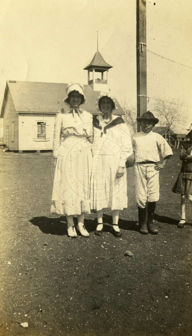 Three unidentified people standing in front of a church. The women are wearing bonnets. 1920s. |