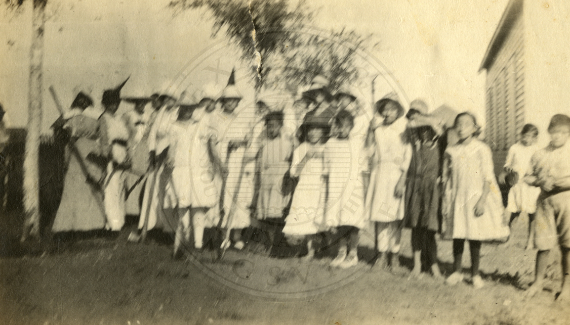 Unidentified group of children in front of a church. |