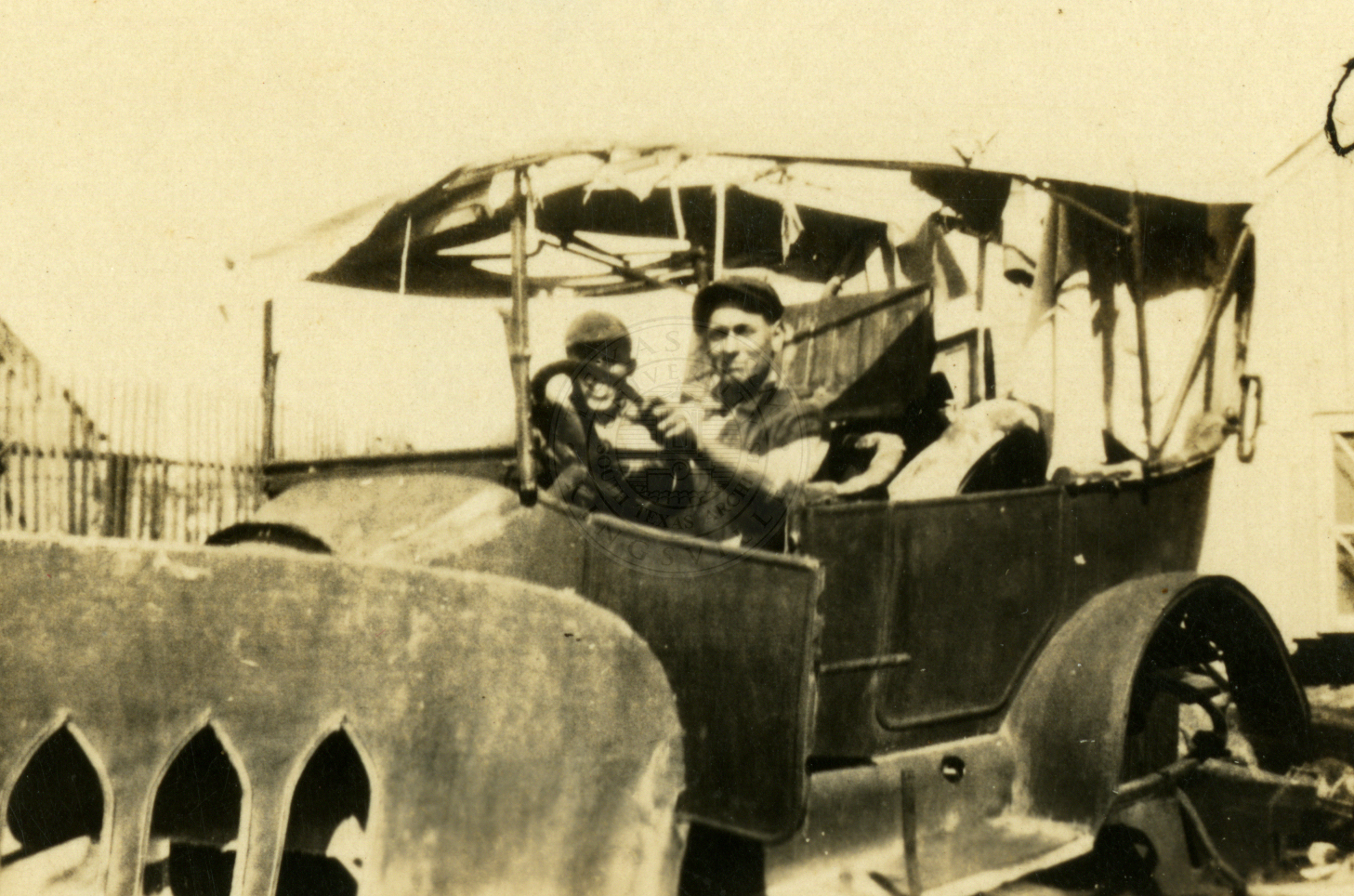 Unidentified group of people sitting in a 1920s automobile. |