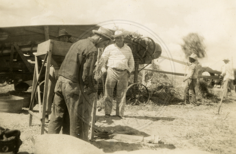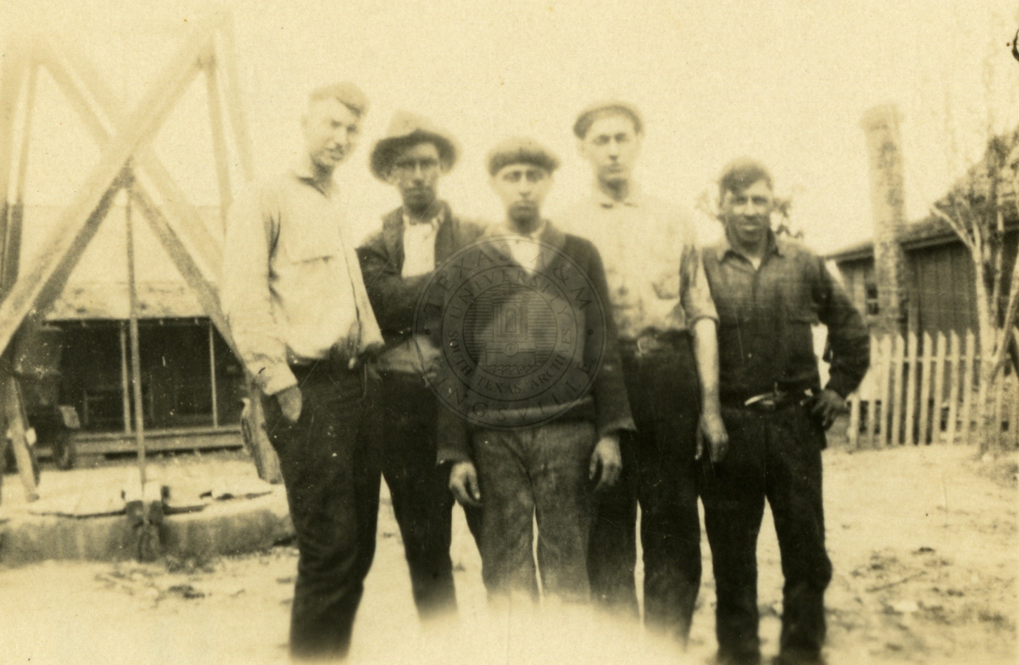 Five unidentified men standing by an oil rig (3 copies). |