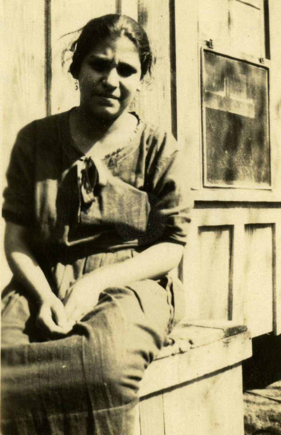 Unidentified woman sitting on a porch. |