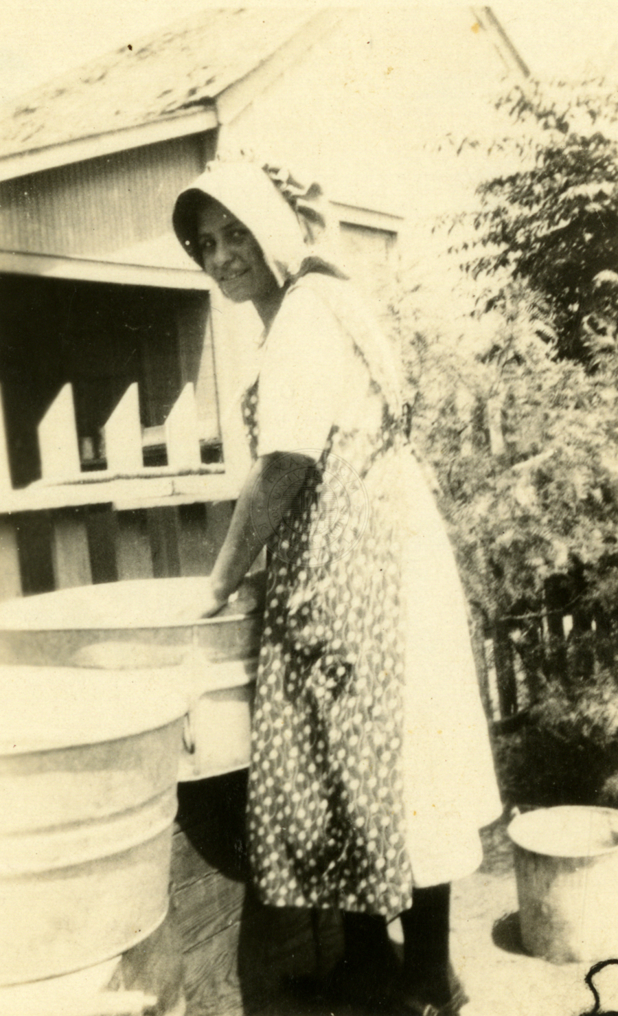 Unidentified woman standing by wash basins in front of her home. |