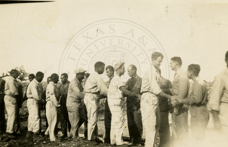Unidentified group of men arranged in two lines, shaking hands. Might be soldiers. |