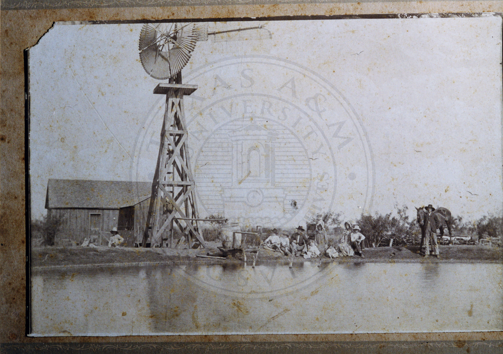 Unidentified family sitting by pond in front of a windmill and a small unidentified structure. |